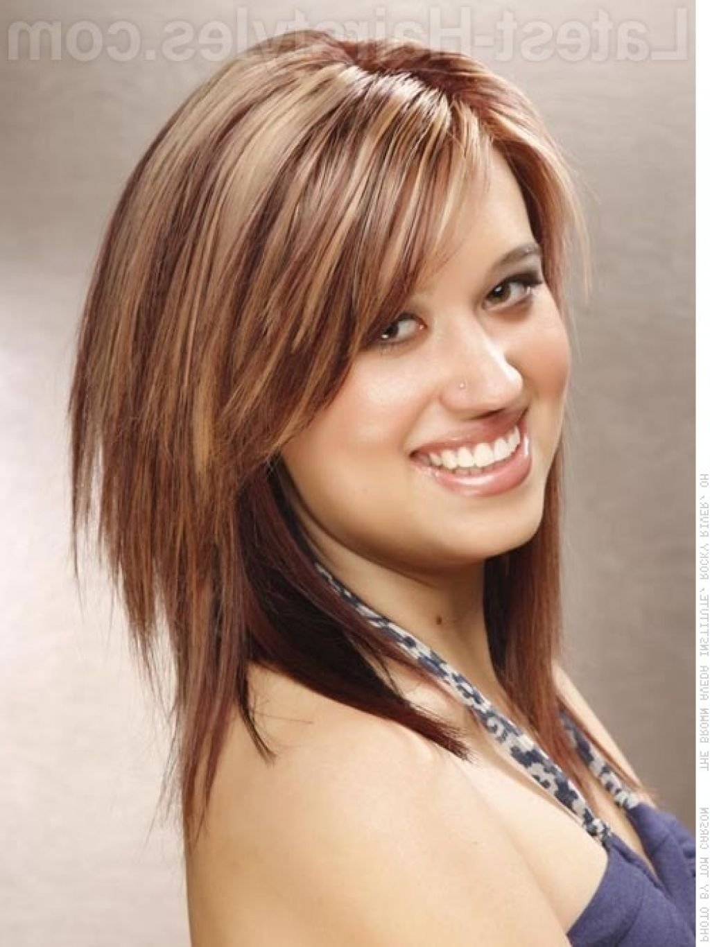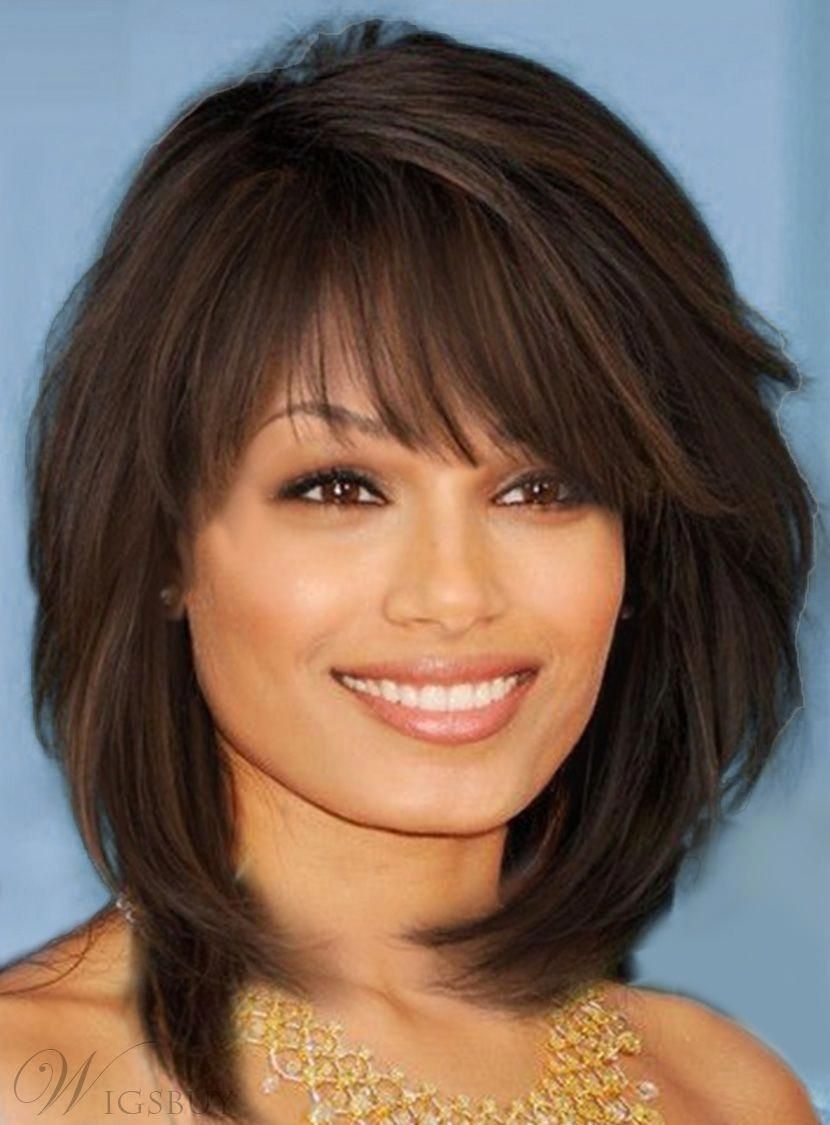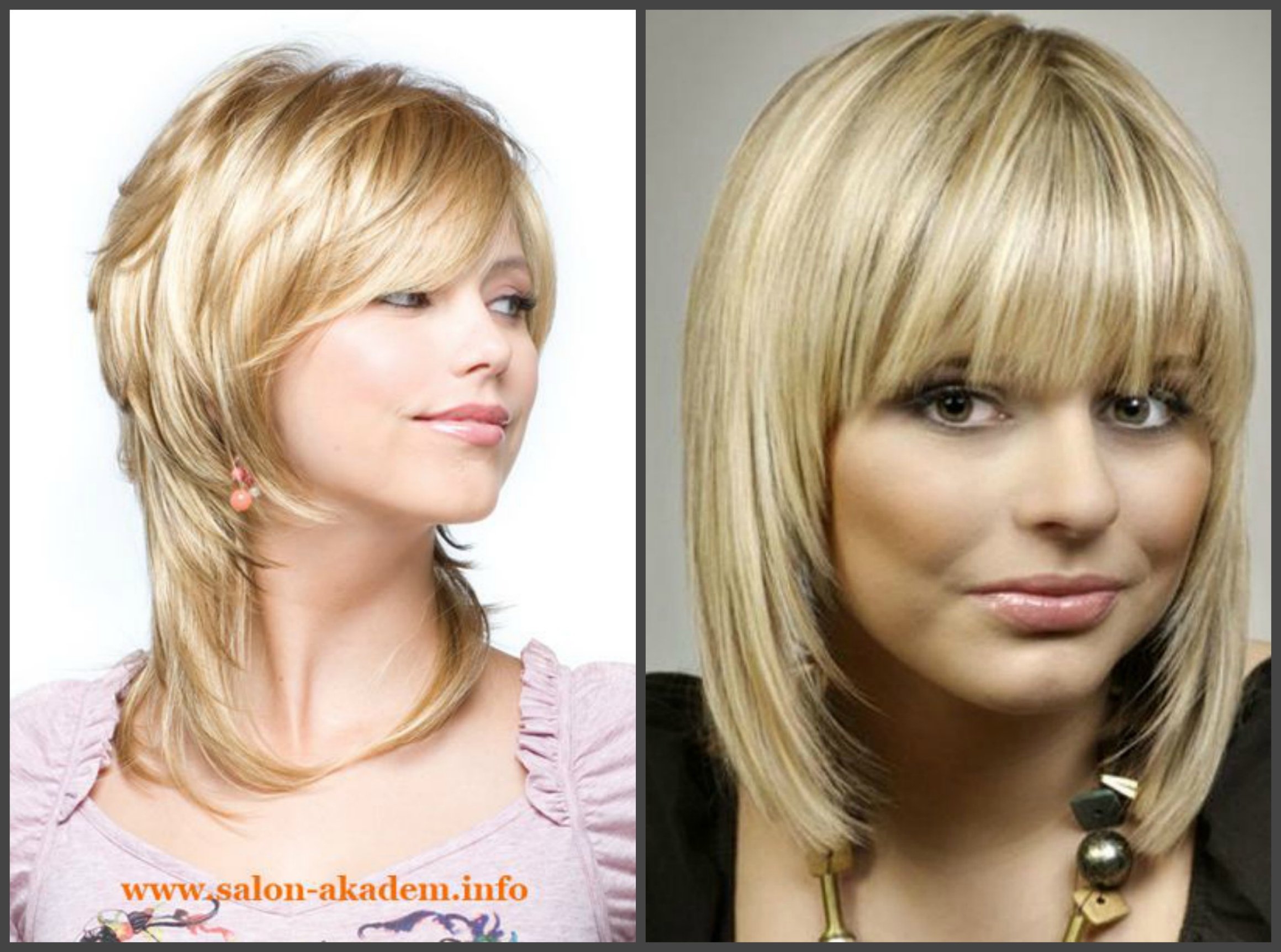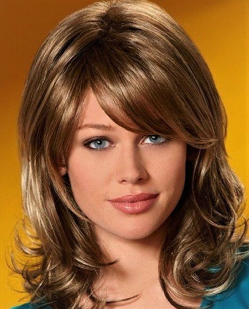 Стильные стрижки Каскад на средние волосы с челкой для круглого лица