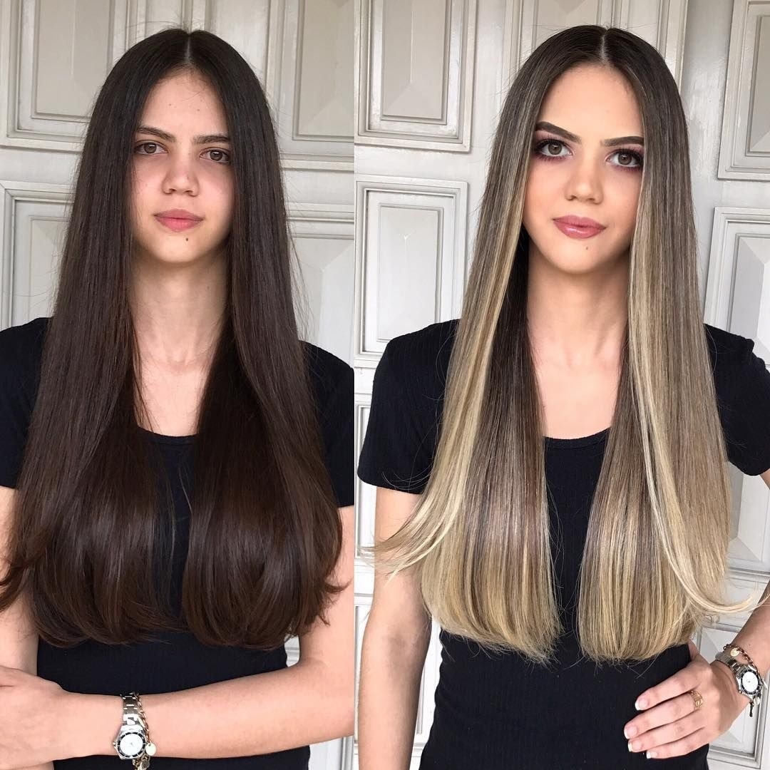 Светлый балаяж на темные прямые волосы