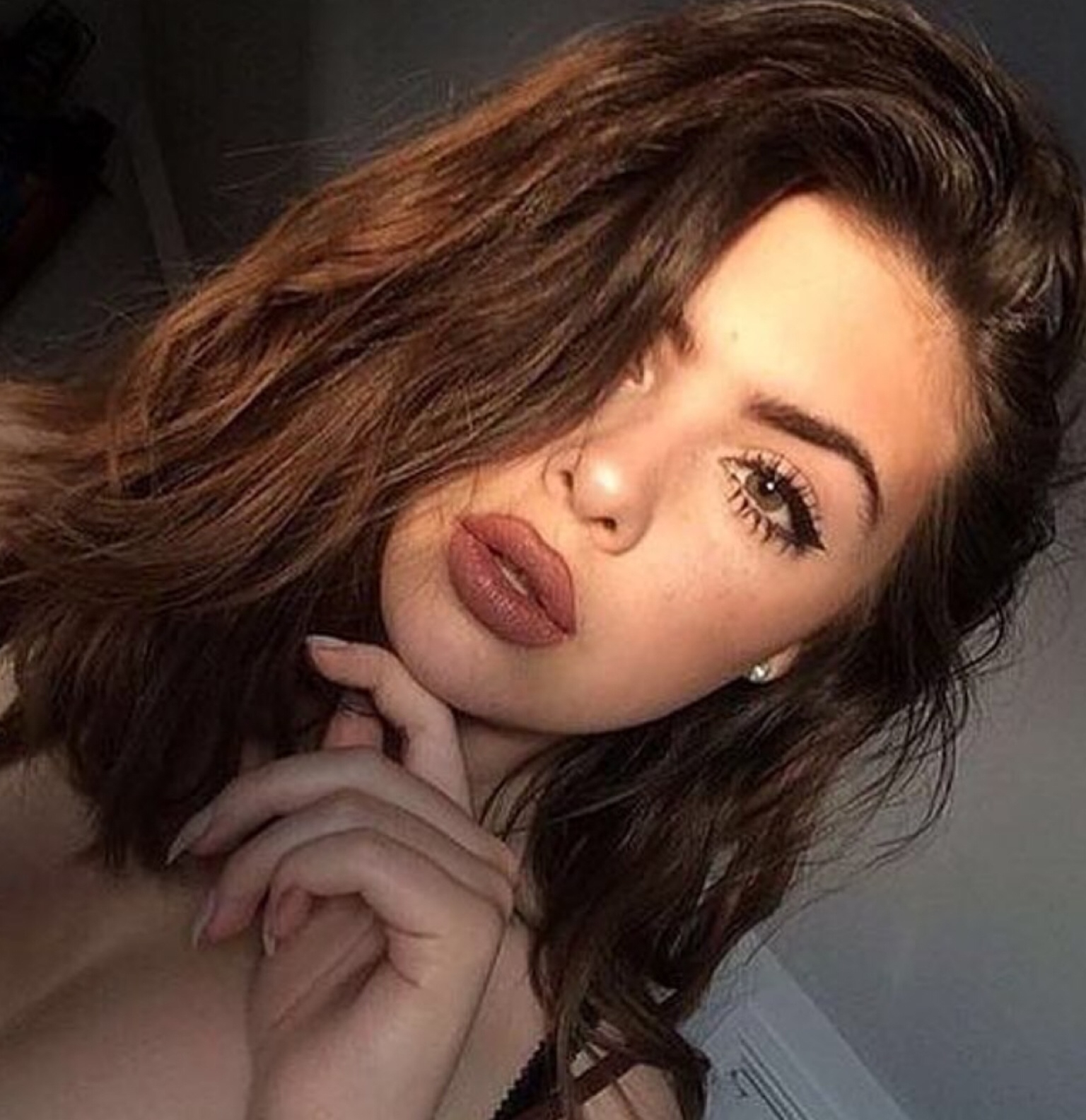 Девушка с каштановыми волосами селфи
