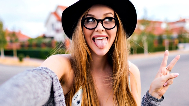 Девушка в очках с высунутым языком