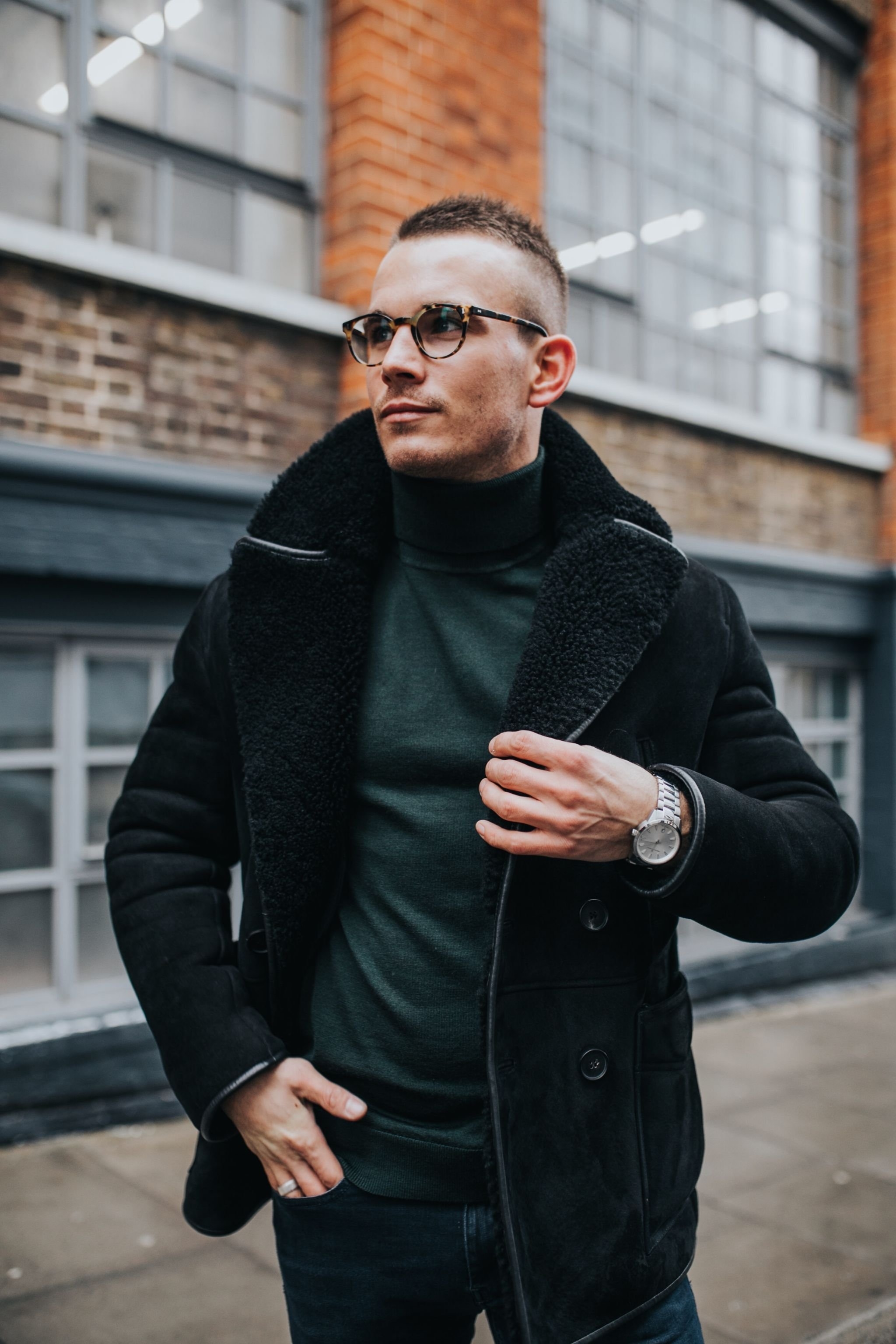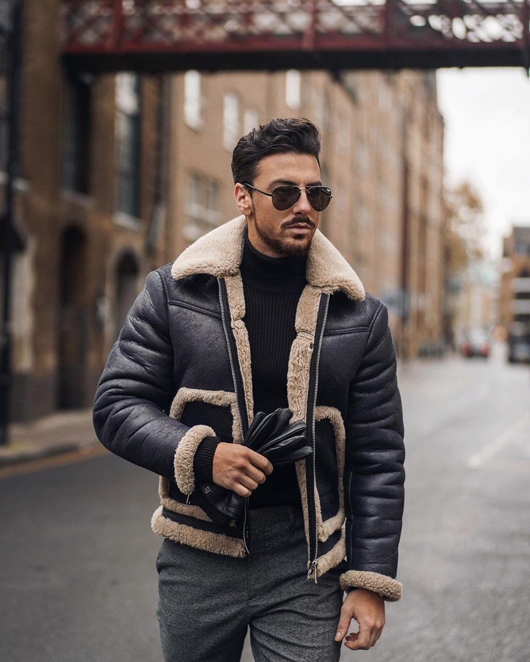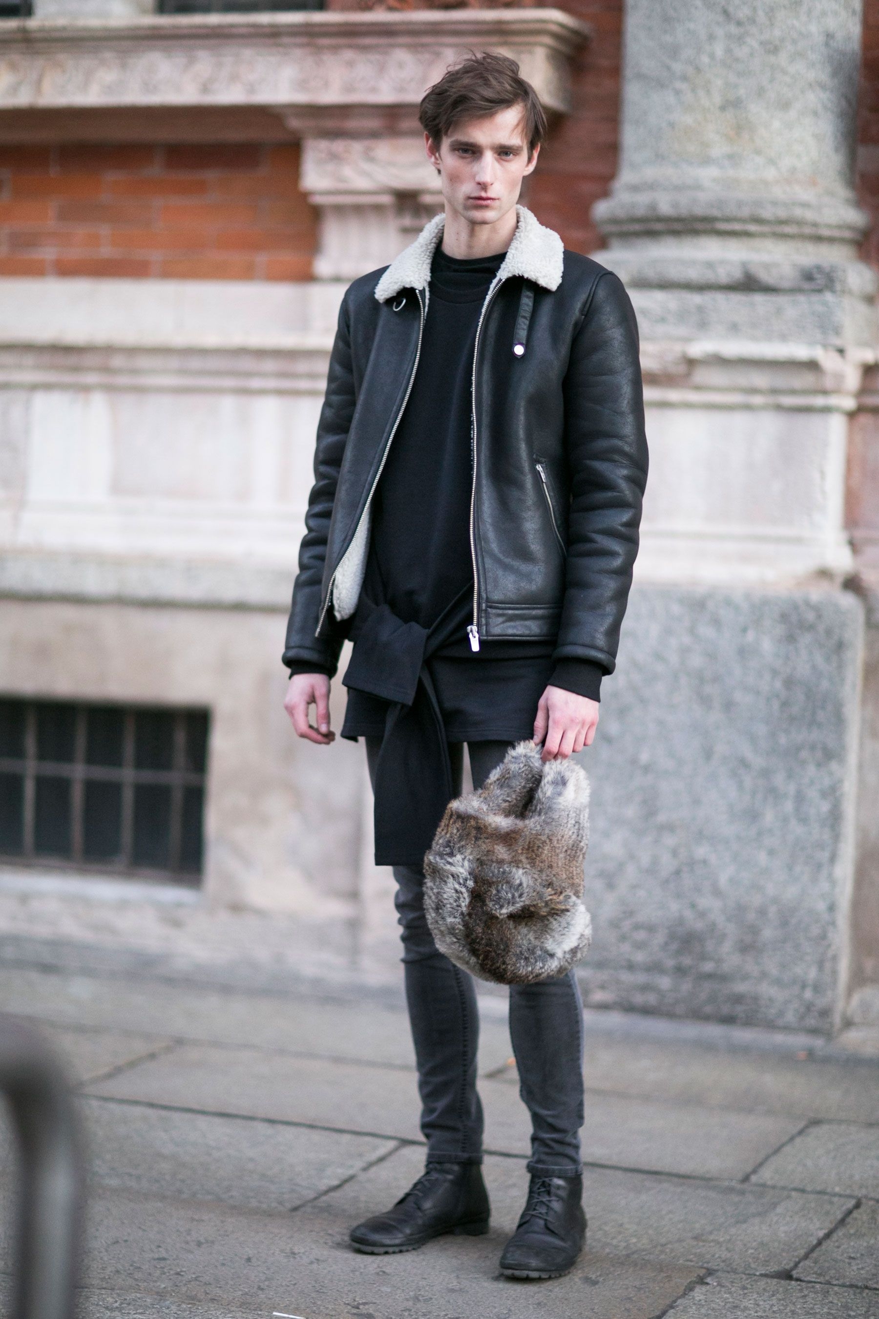 Мужской лук с черной дубленкой
