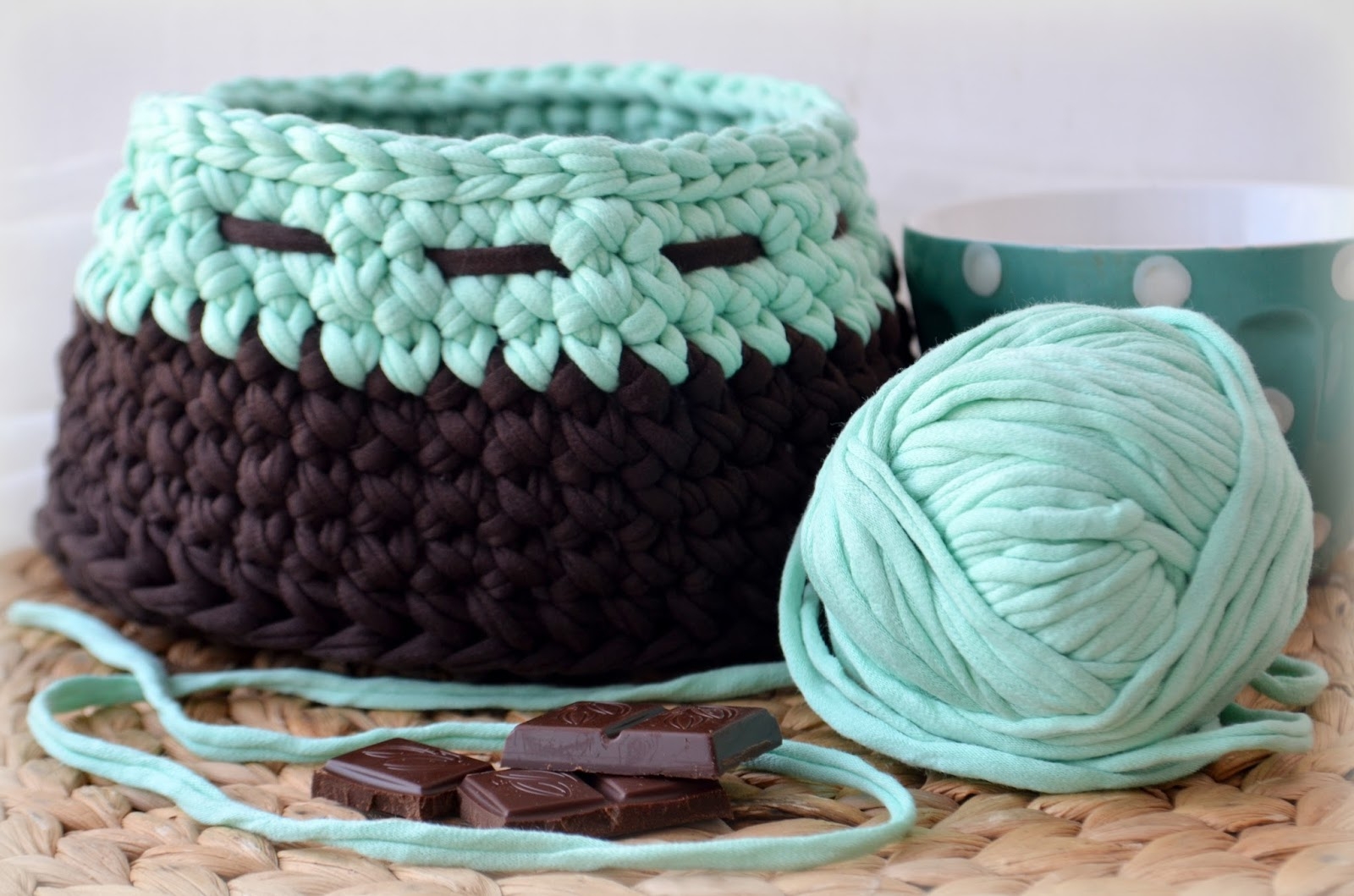 Бирюзовая вязаная корзинка