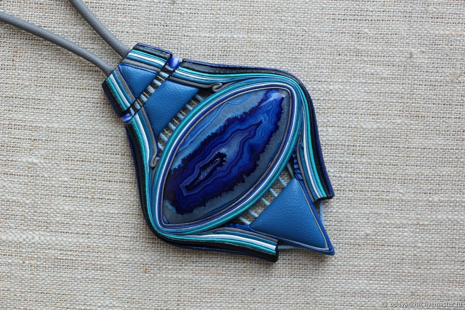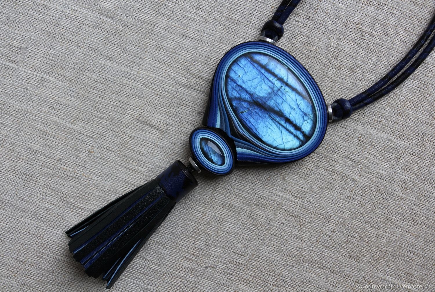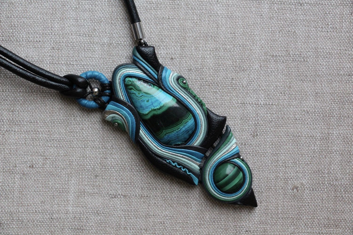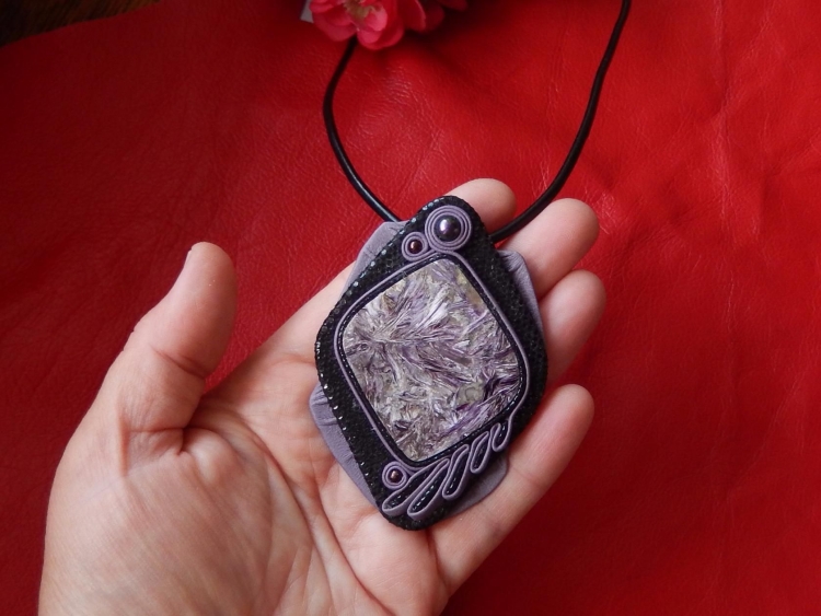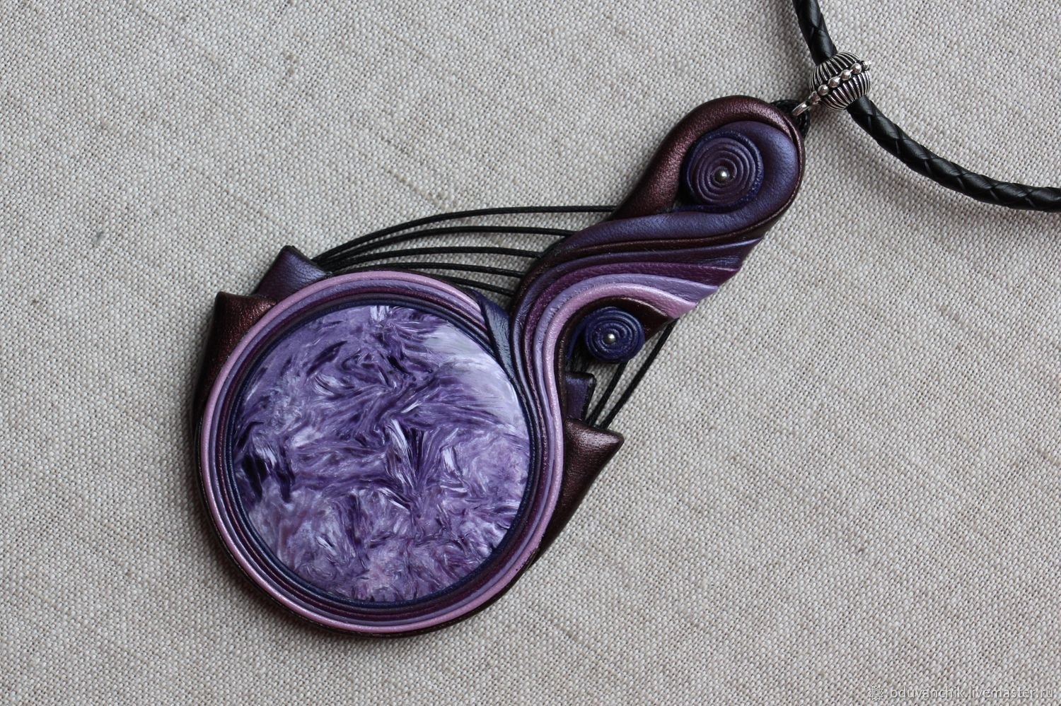 Имитация чароита из полимерной глины кулон с натуральной кожей
