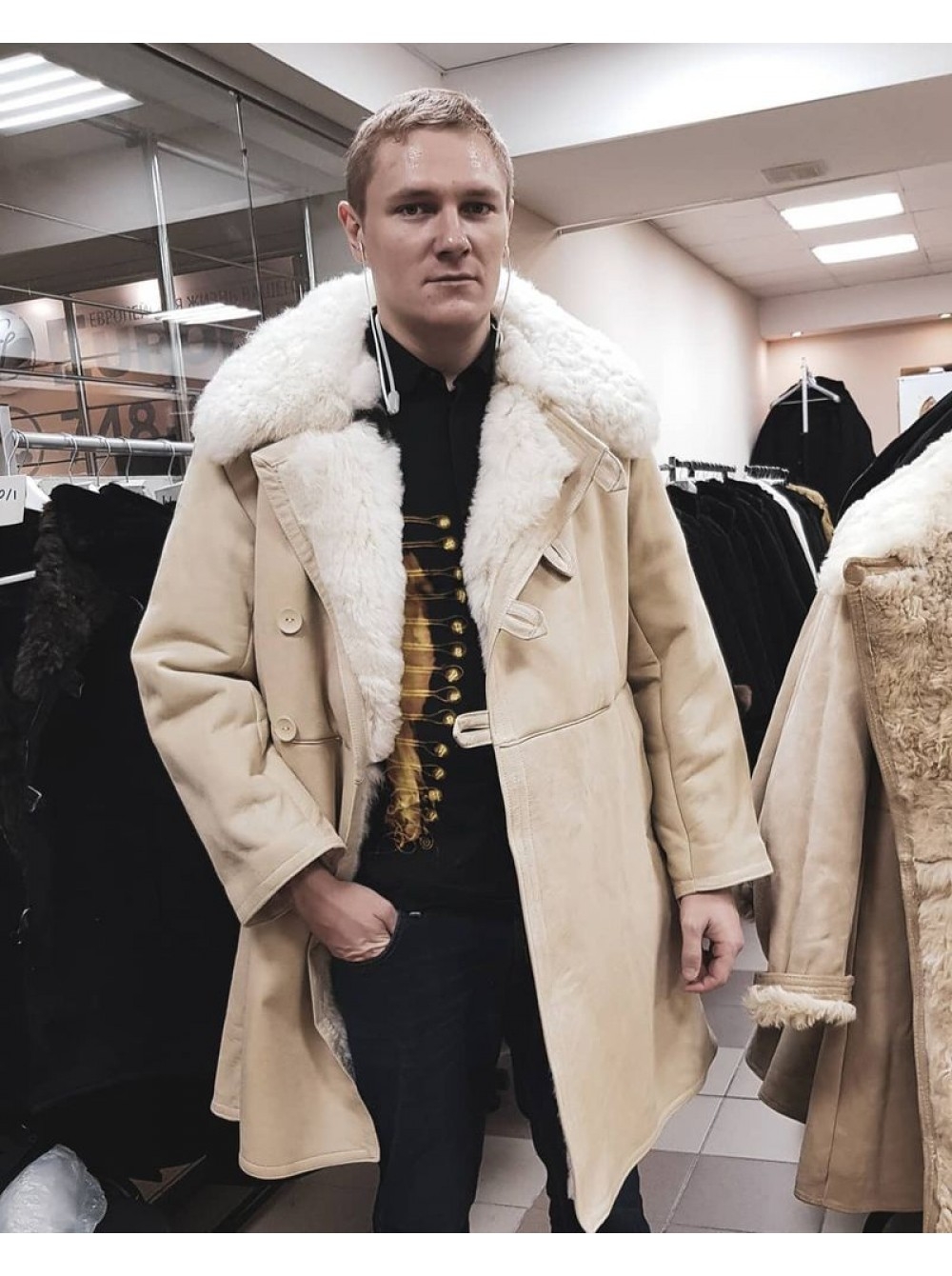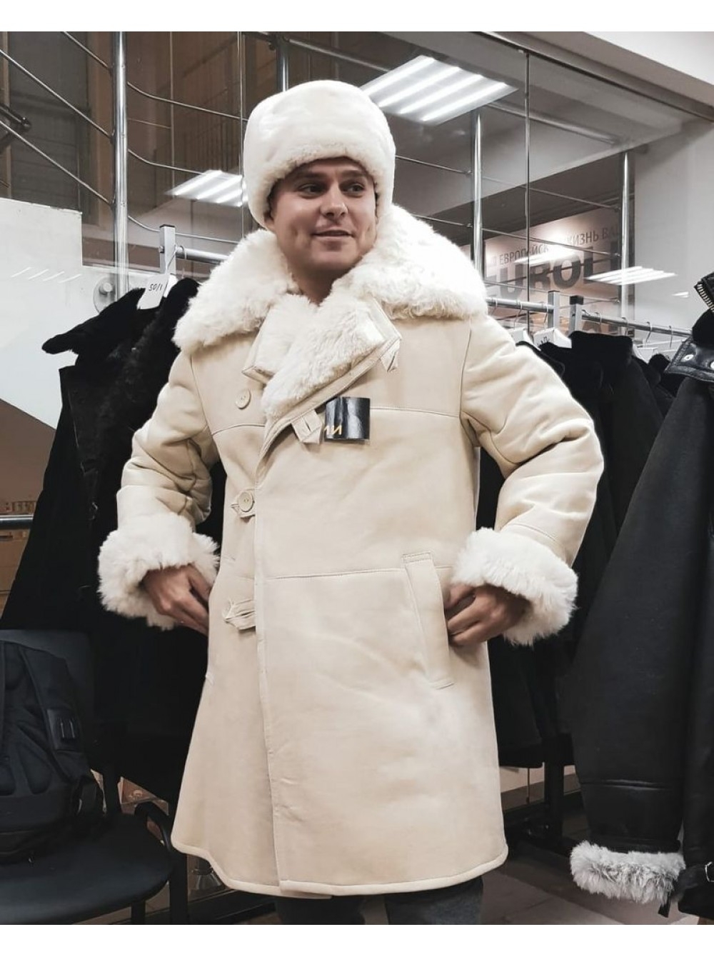 Белая мужская дубленка