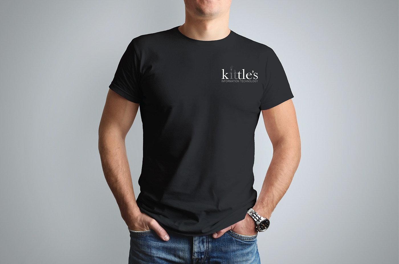 Чел в футболке на сером фоне