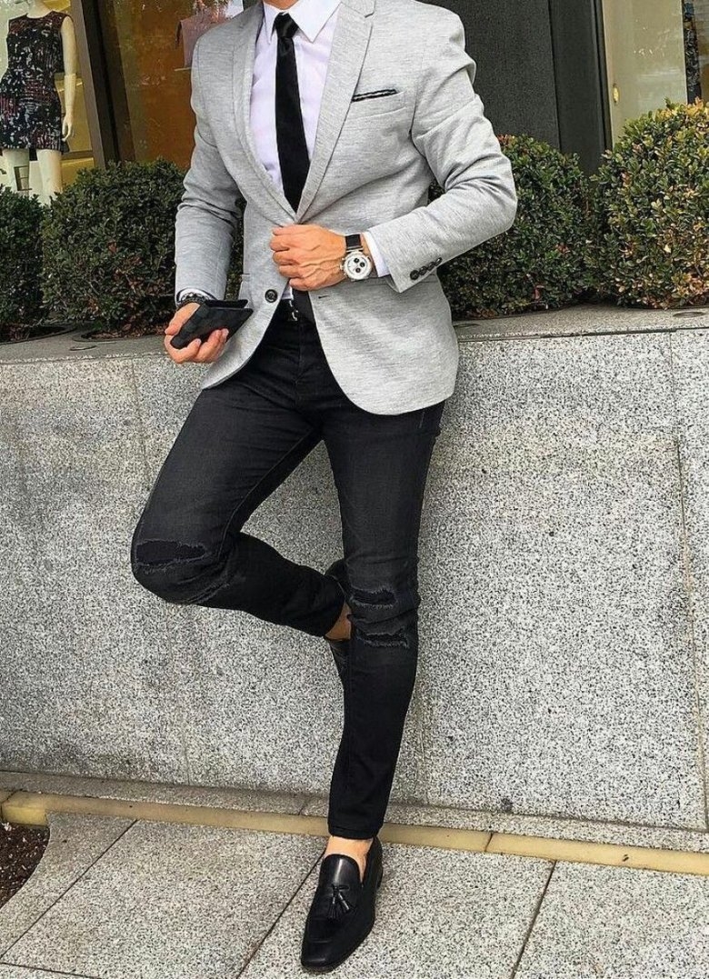 Серый пиджак с черными брюками
