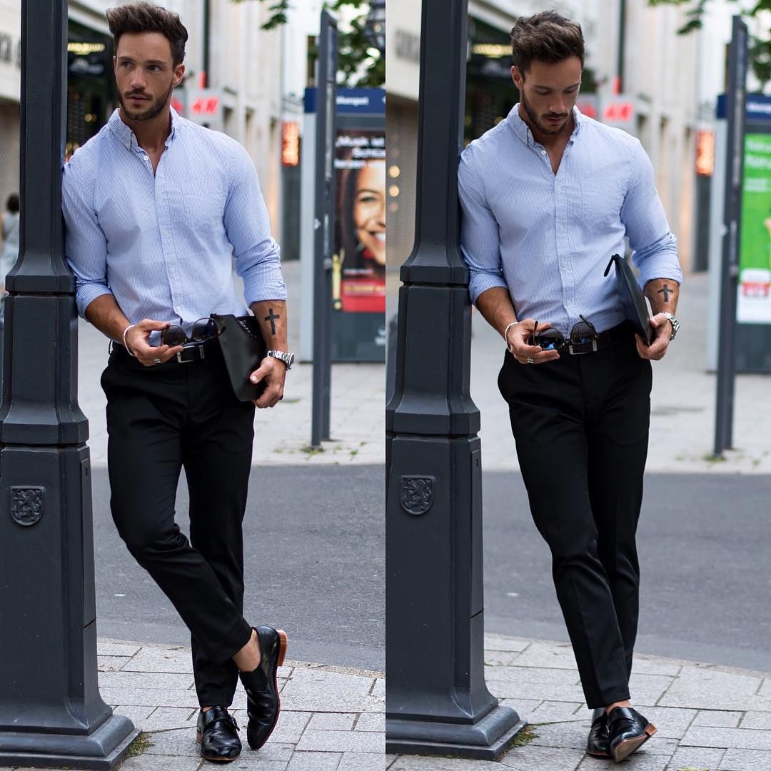 Голубая рубашка с черными брюками