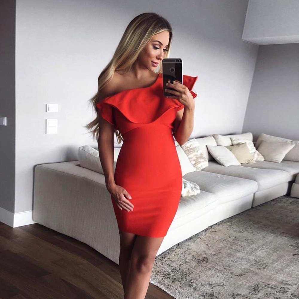 Красное обтягивающее платье с открытыми плечами