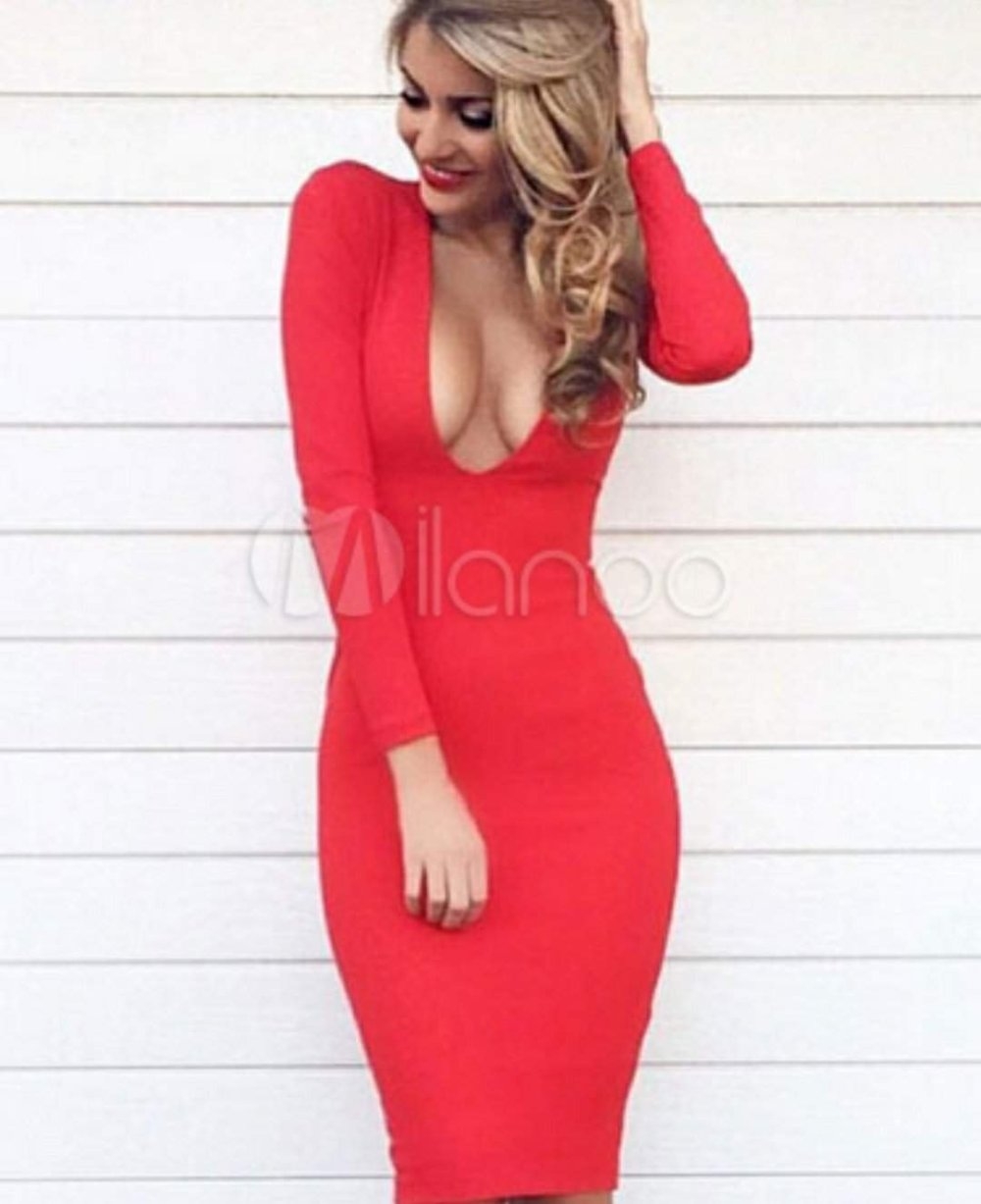 Красное обтягивающее платье до колен с рукавами