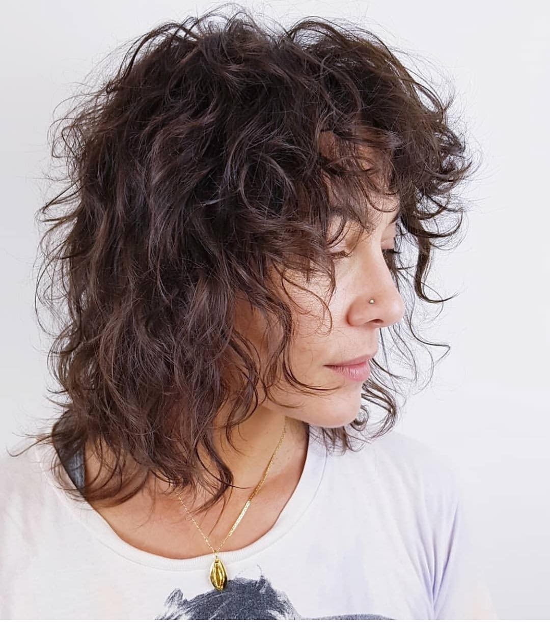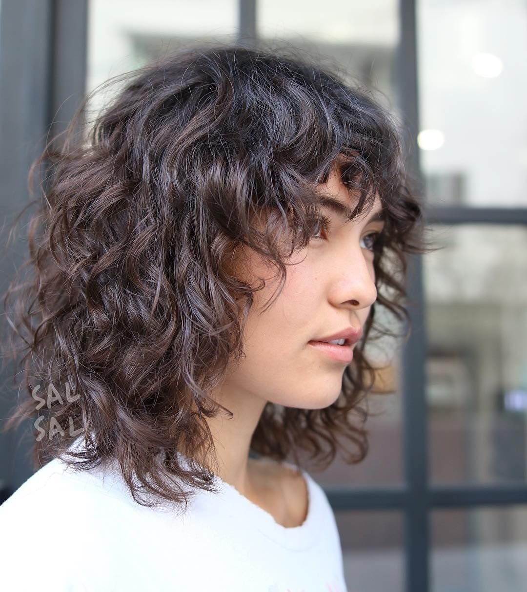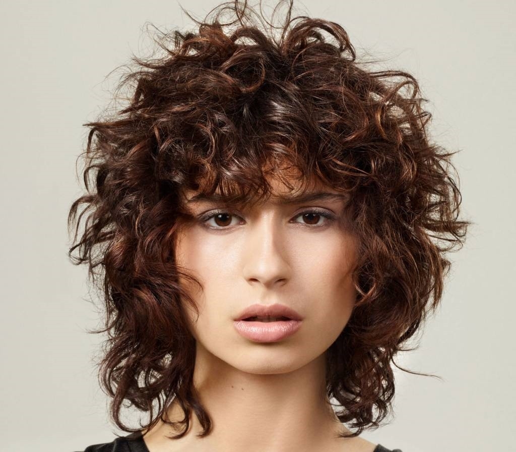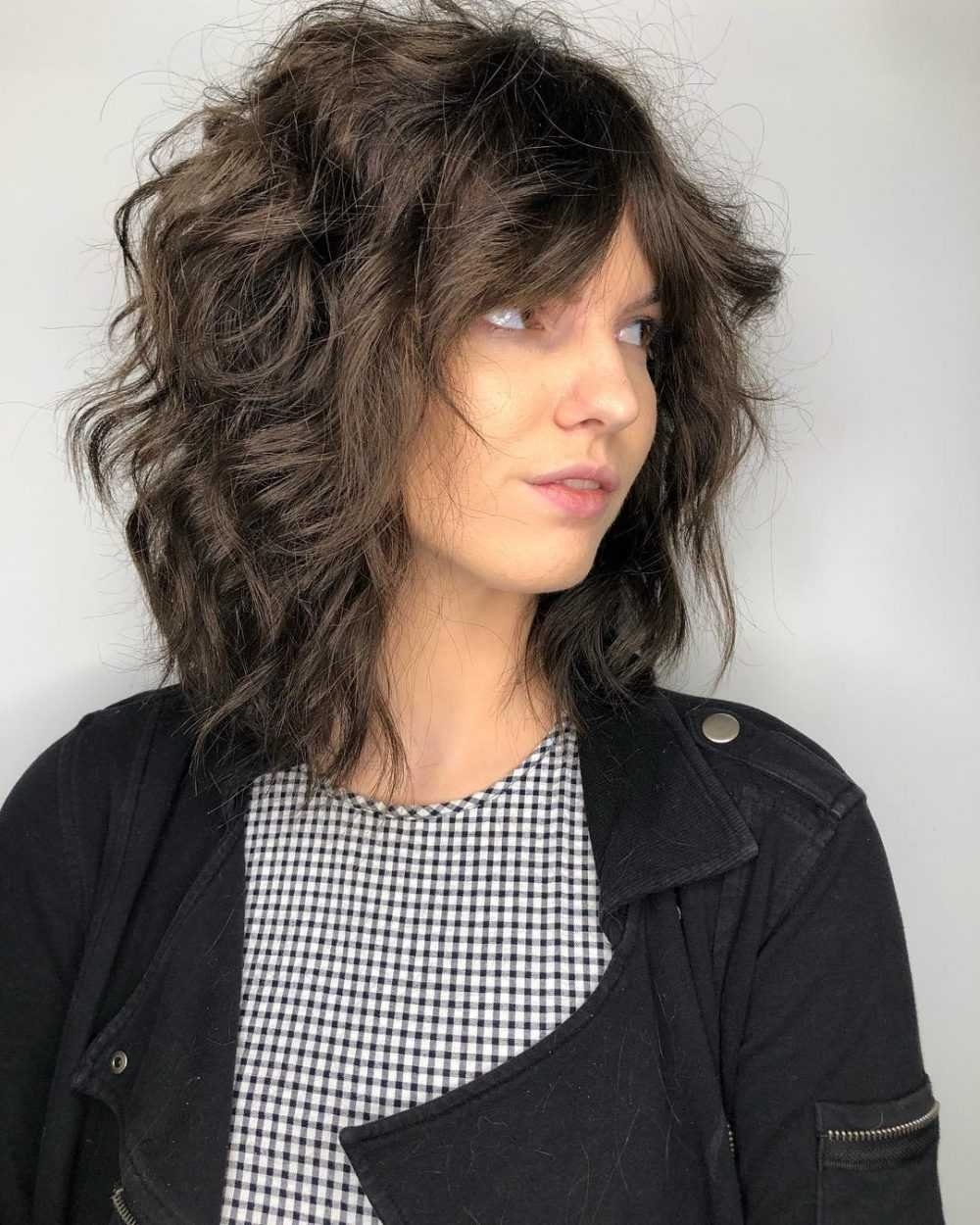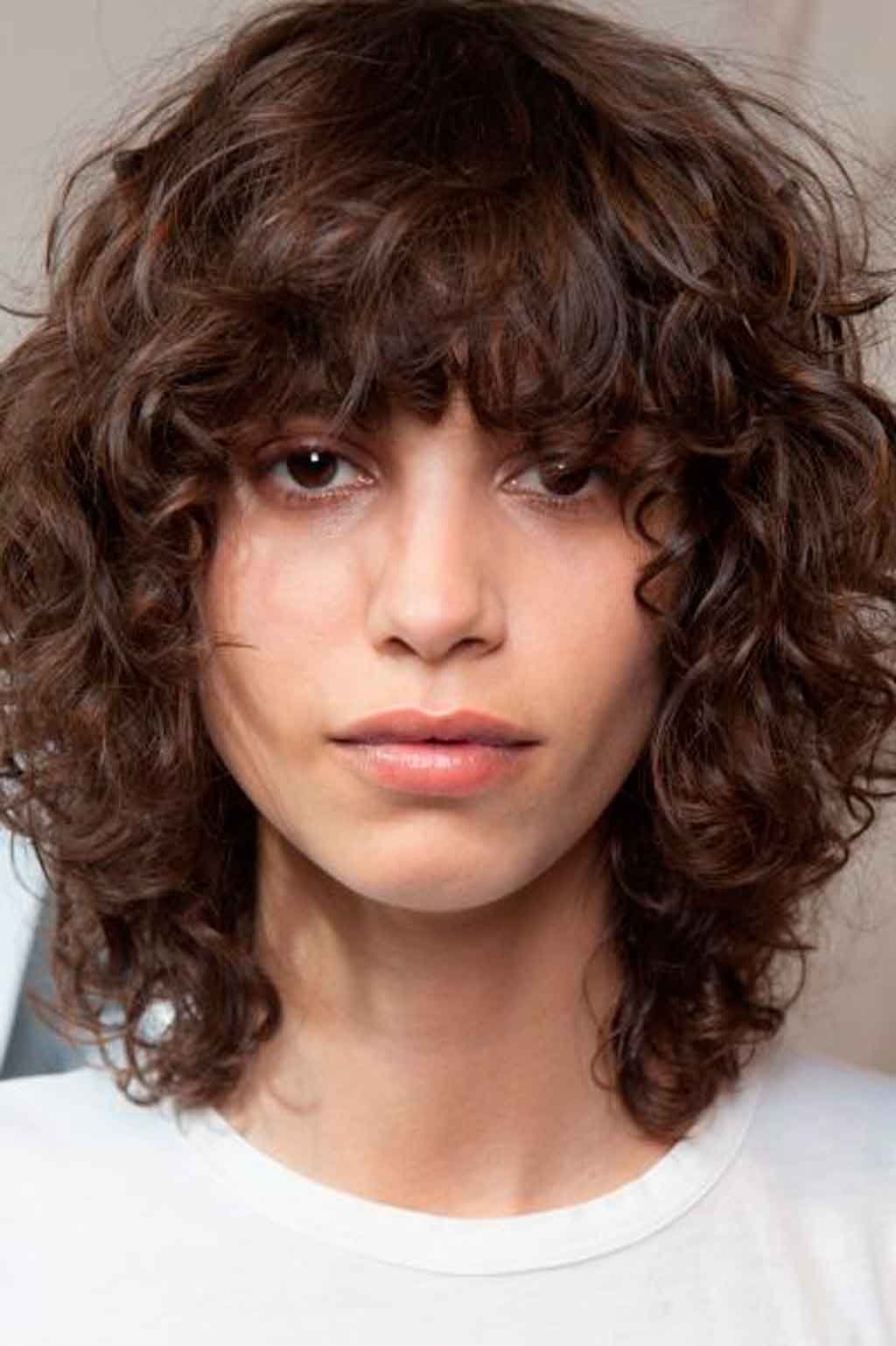 Стрижка Каскад на средние волосы с челкой 2022 на волнистые волосы