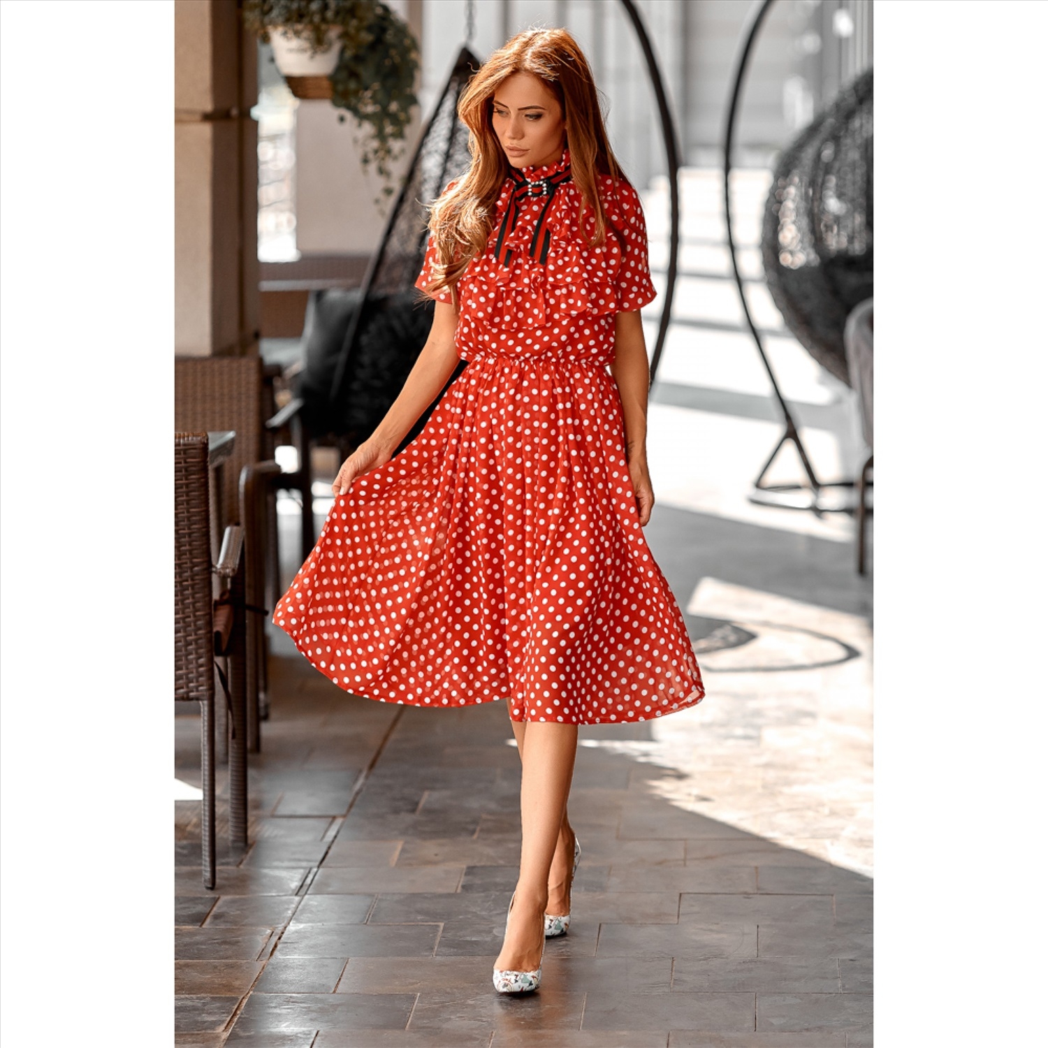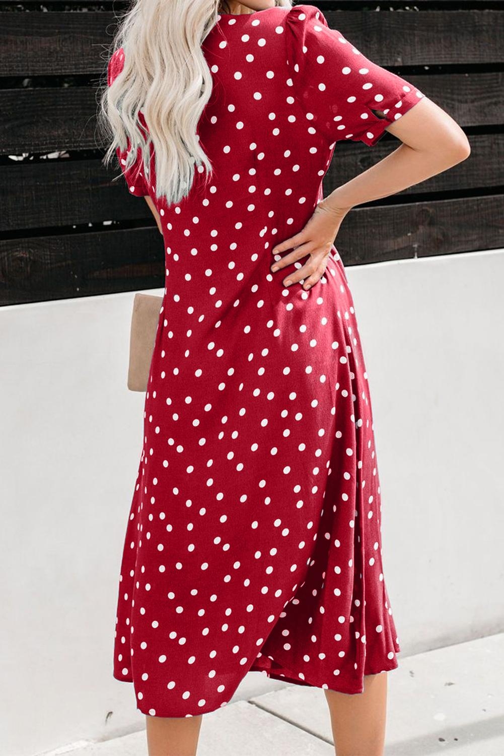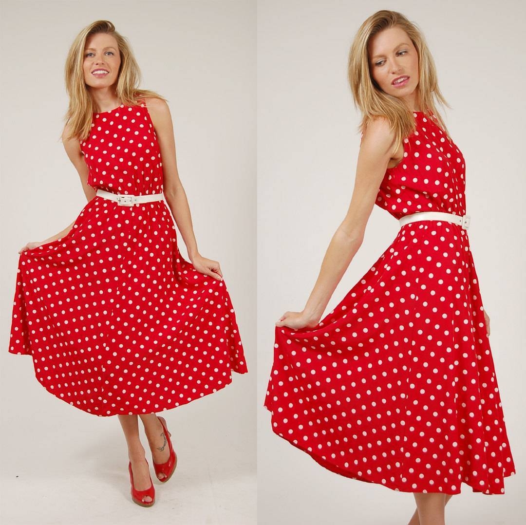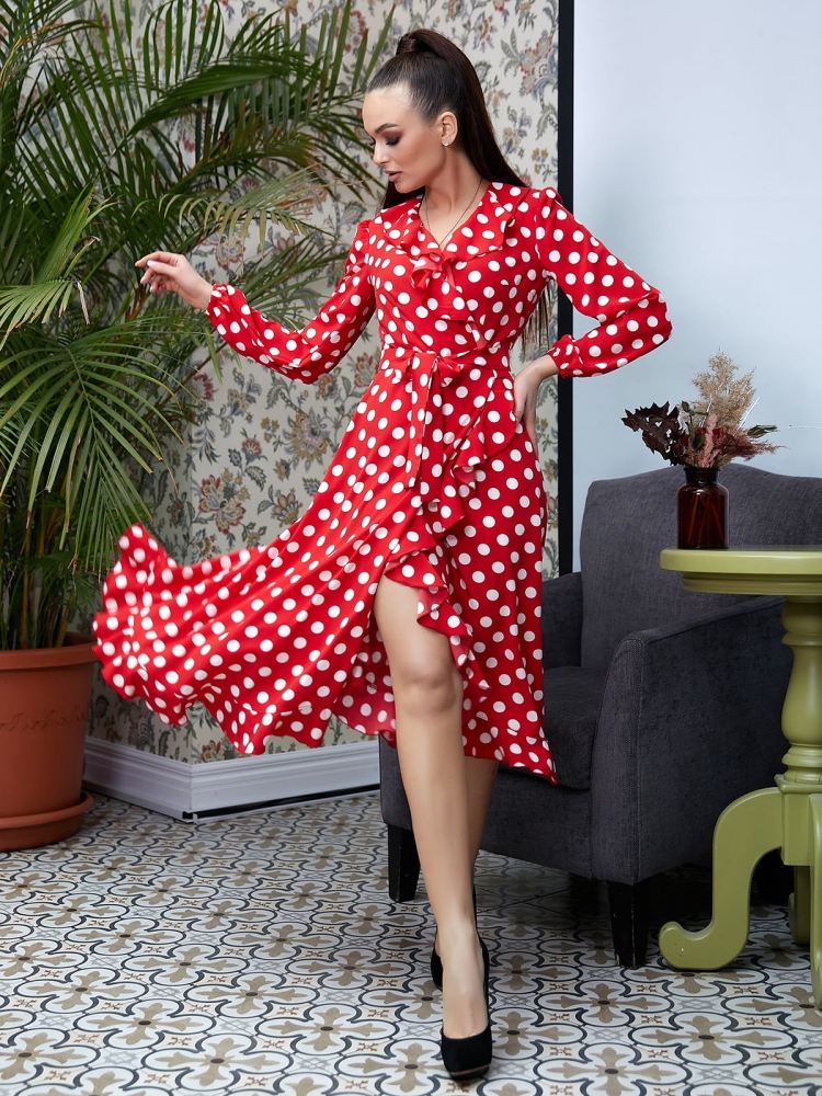 Красное платье в белый горошек миди