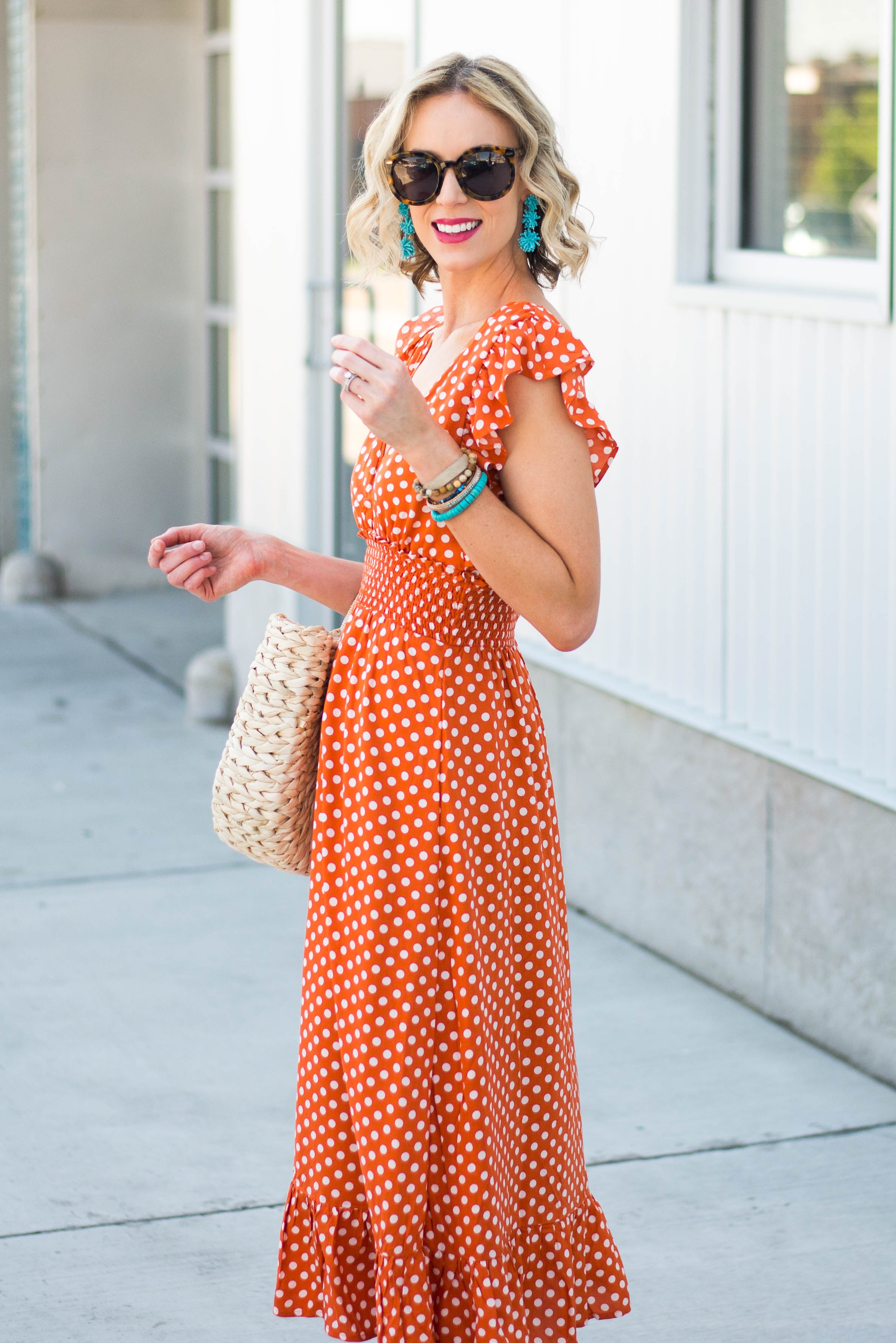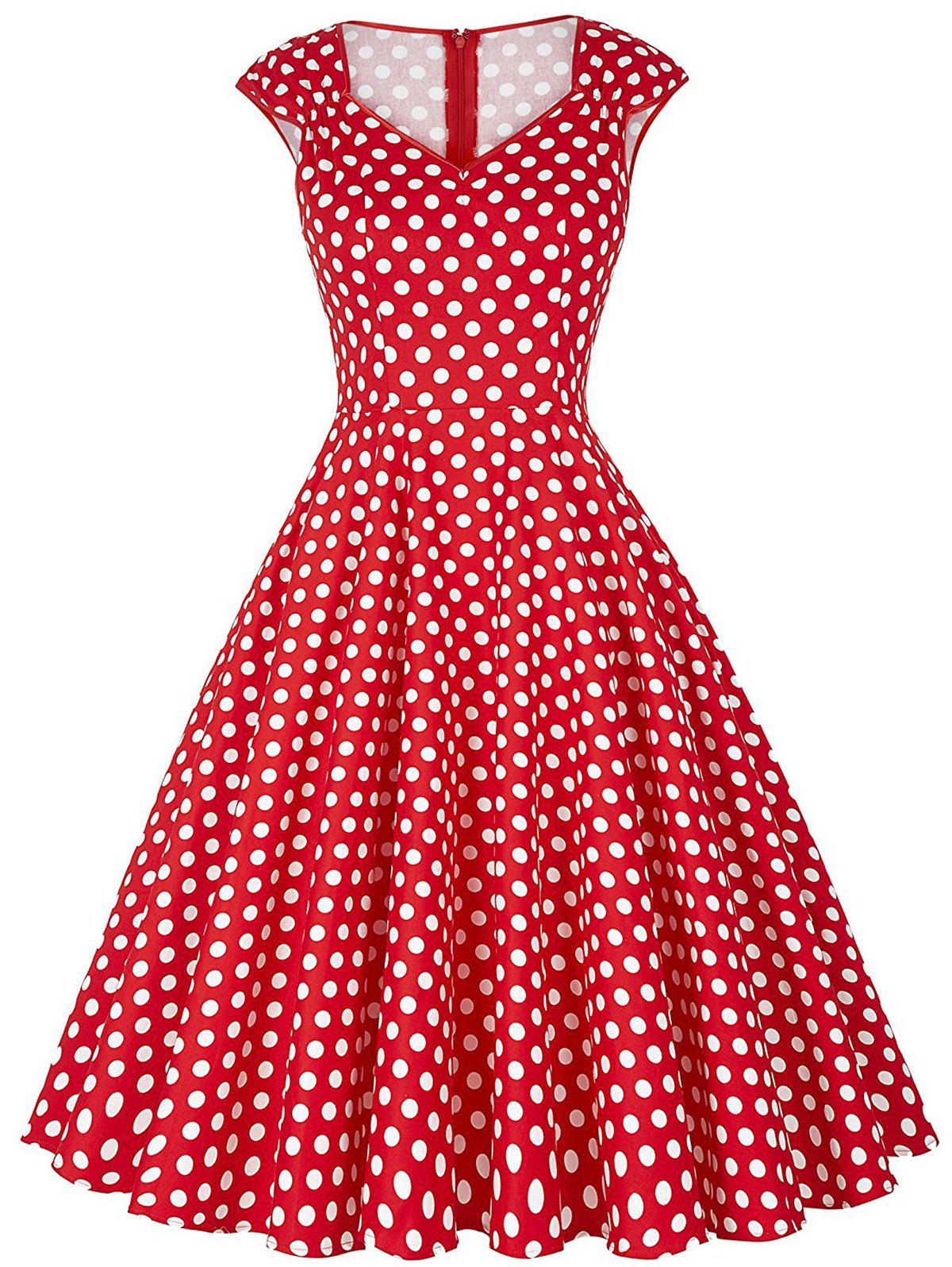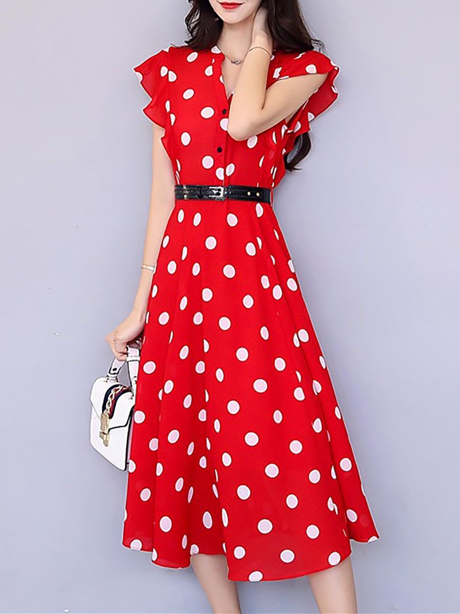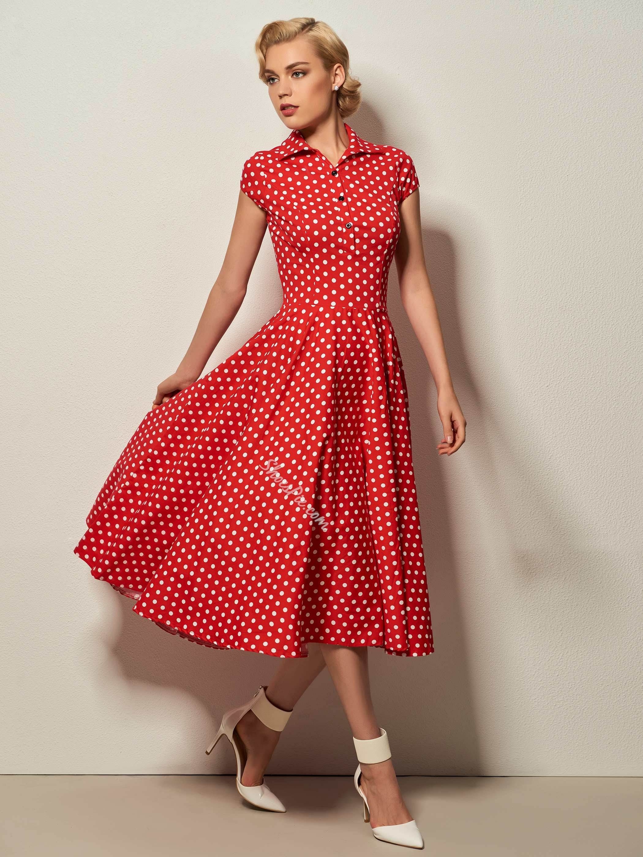 Красное платье в белый горошек миди