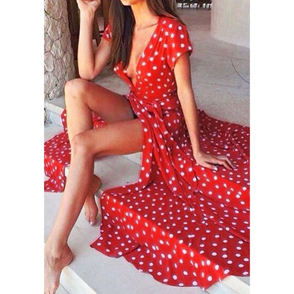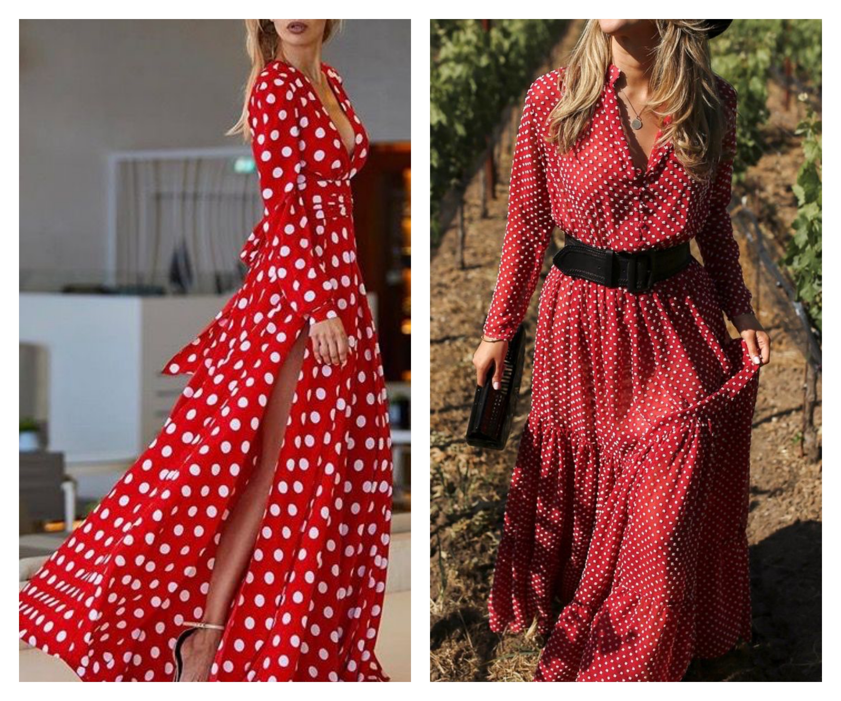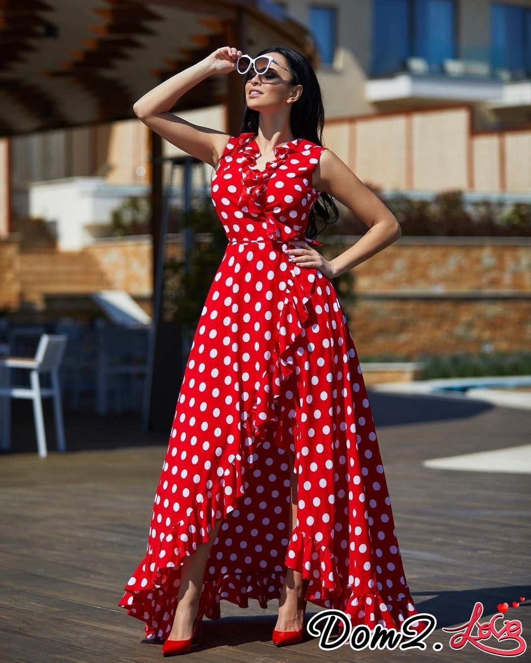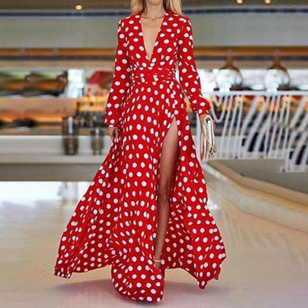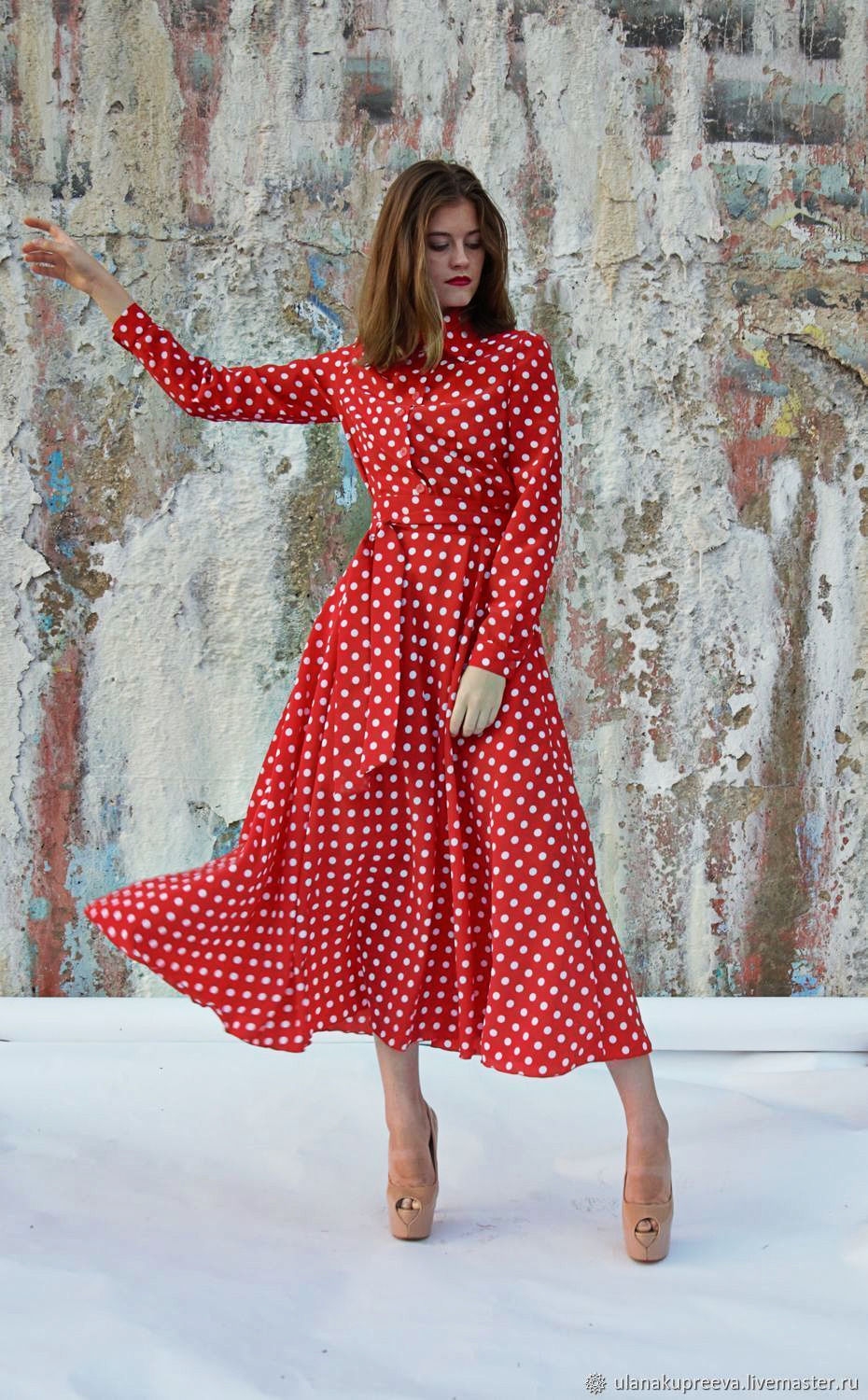 Красное платье в горошек в пол