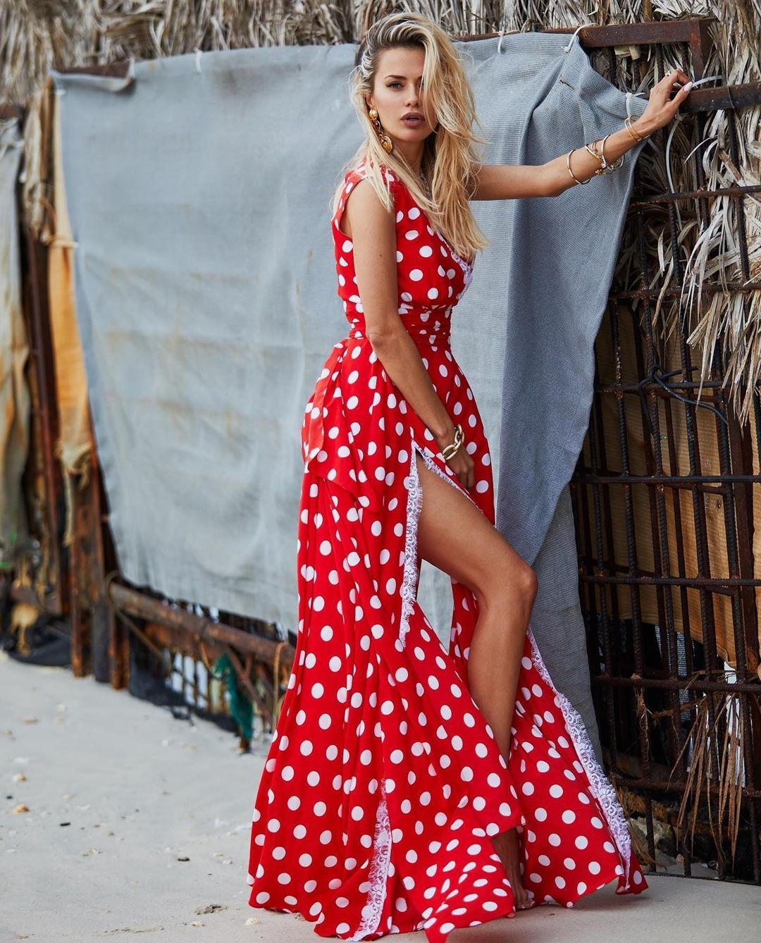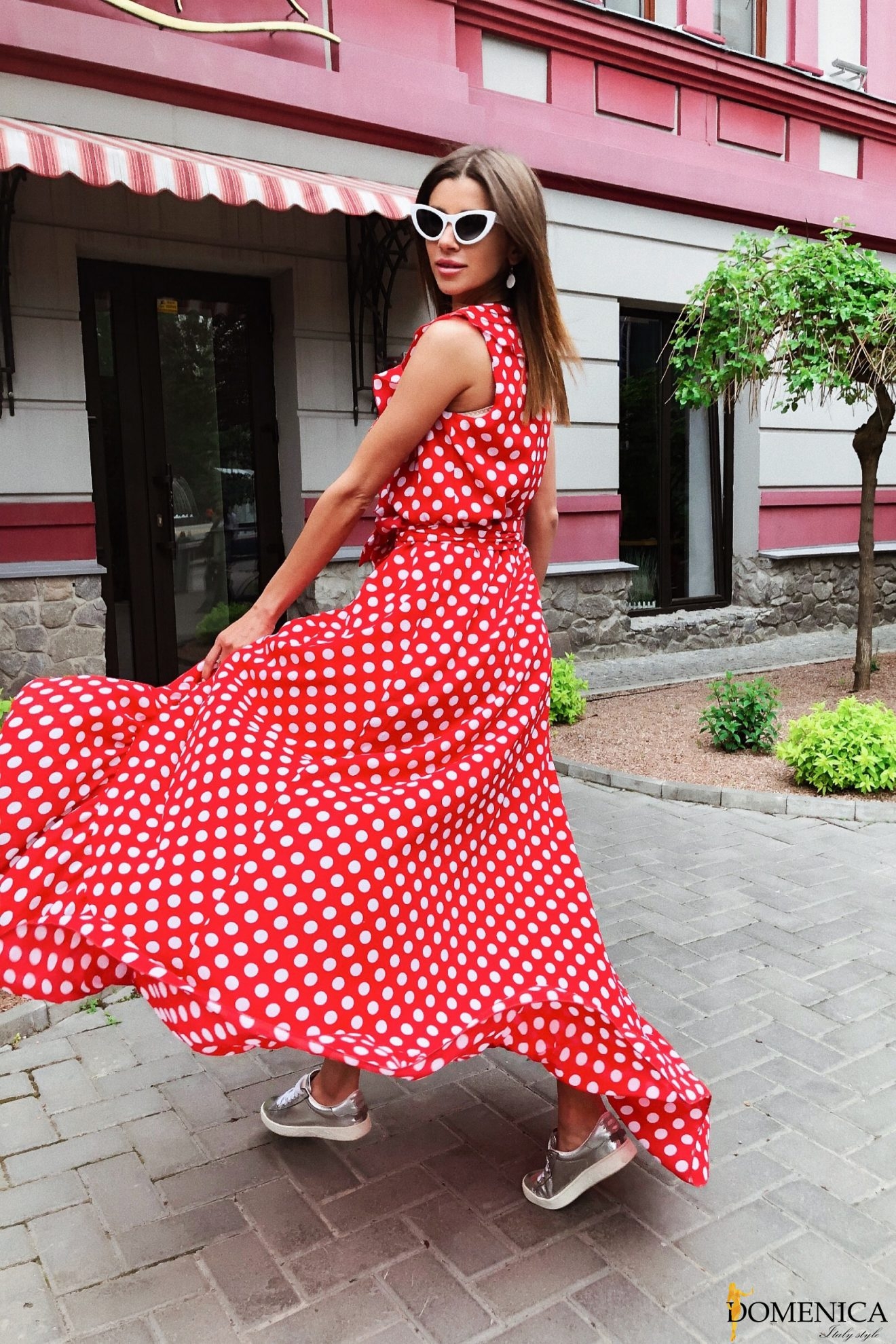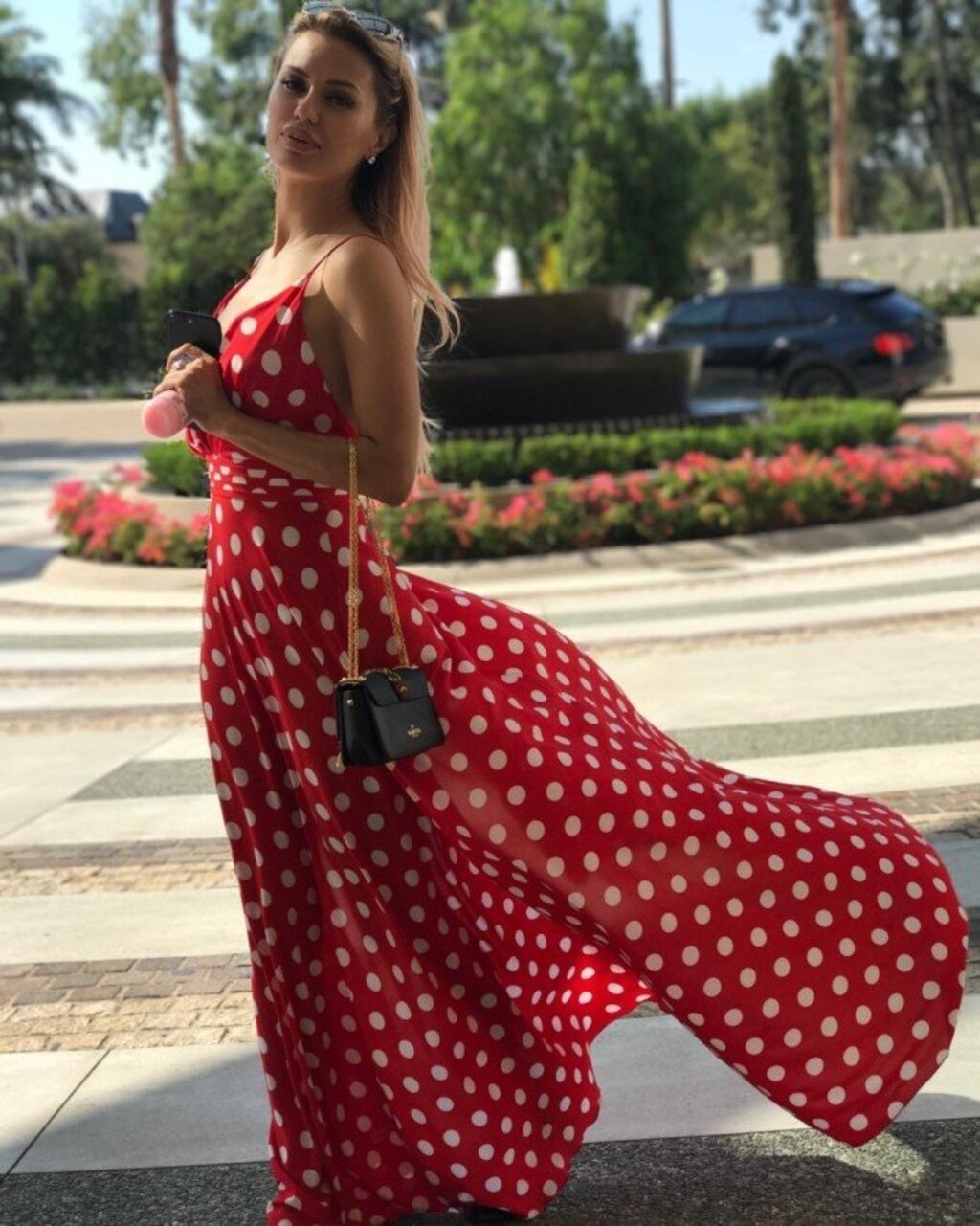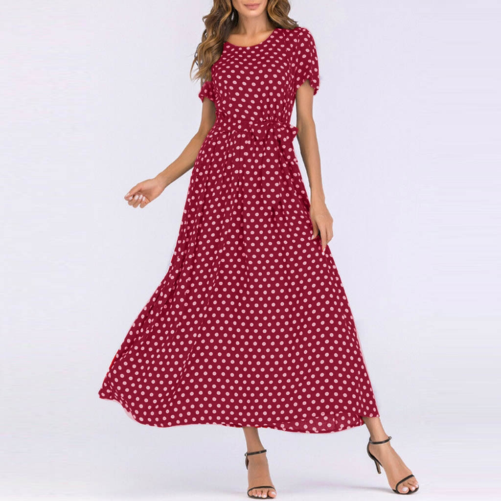 Красное платье в горошек в пол