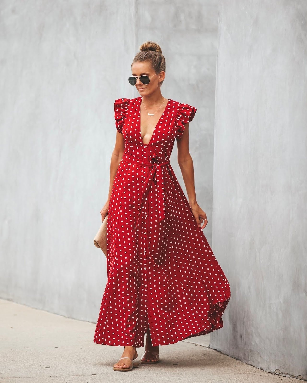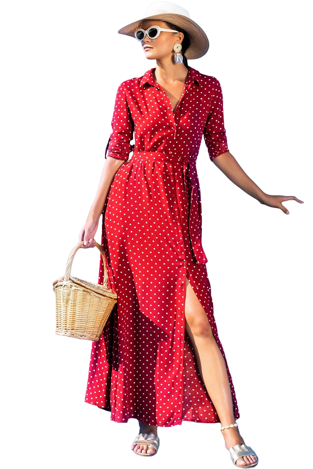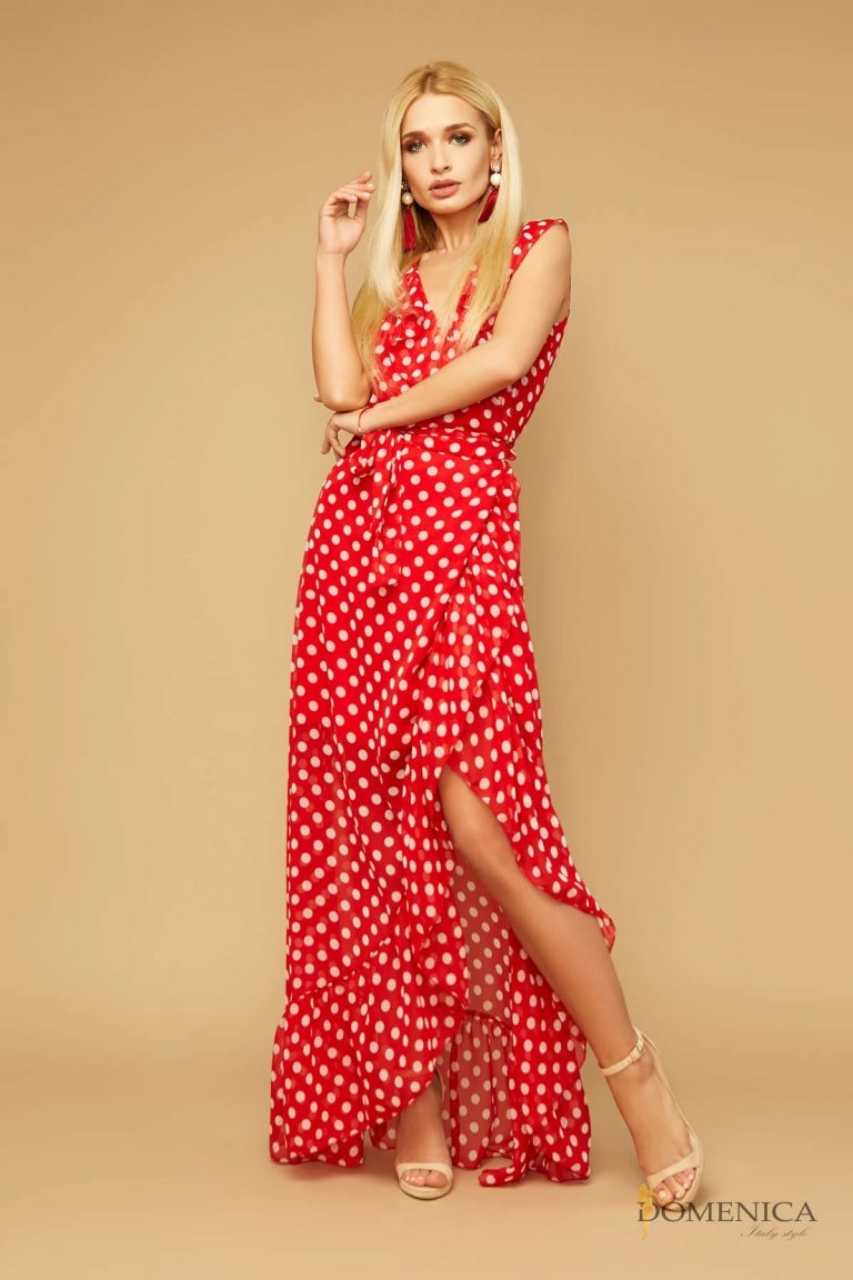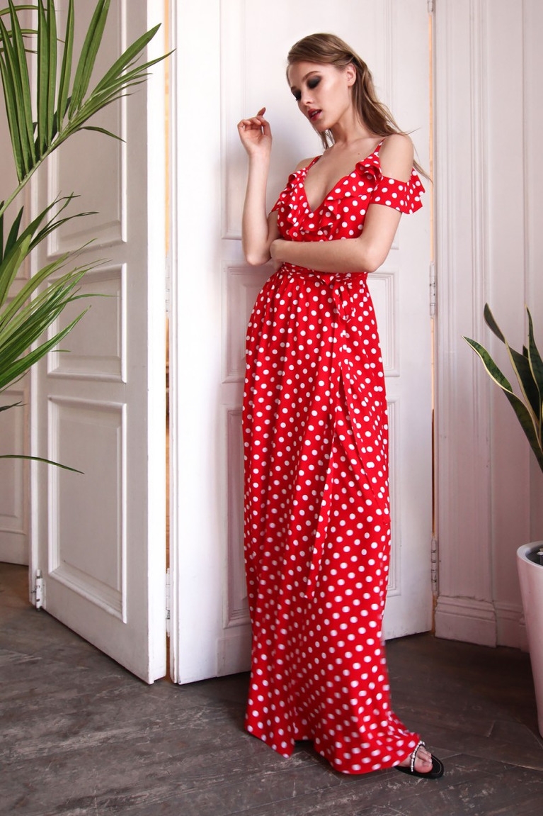 Красное платье в горошек длинное