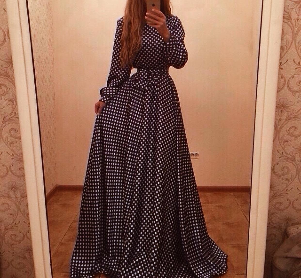 Платья в пол с длинным рукавом в горошек