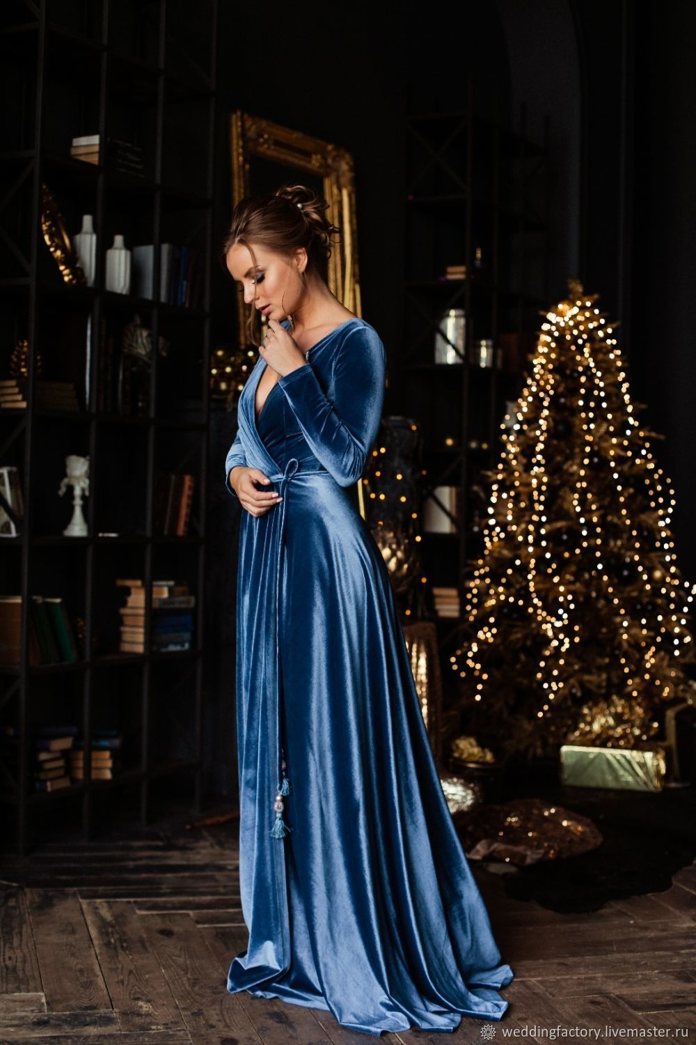 Голубое бархатное платье
