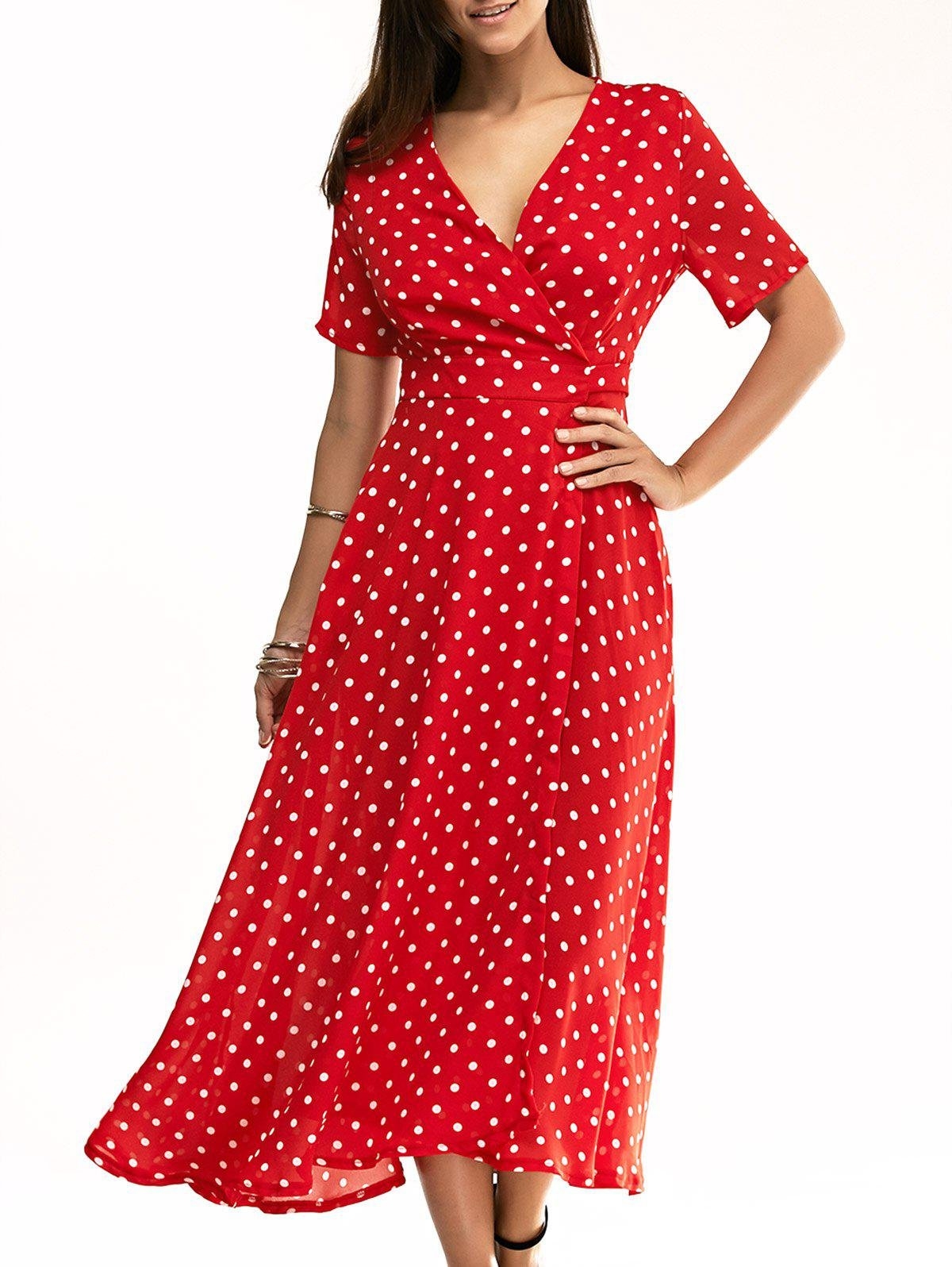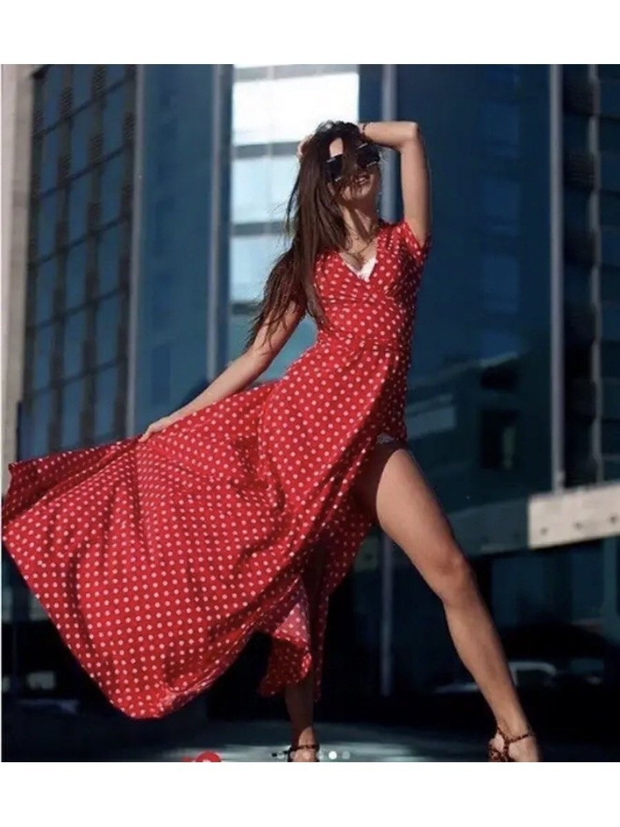 Красное платье в горошек длинное