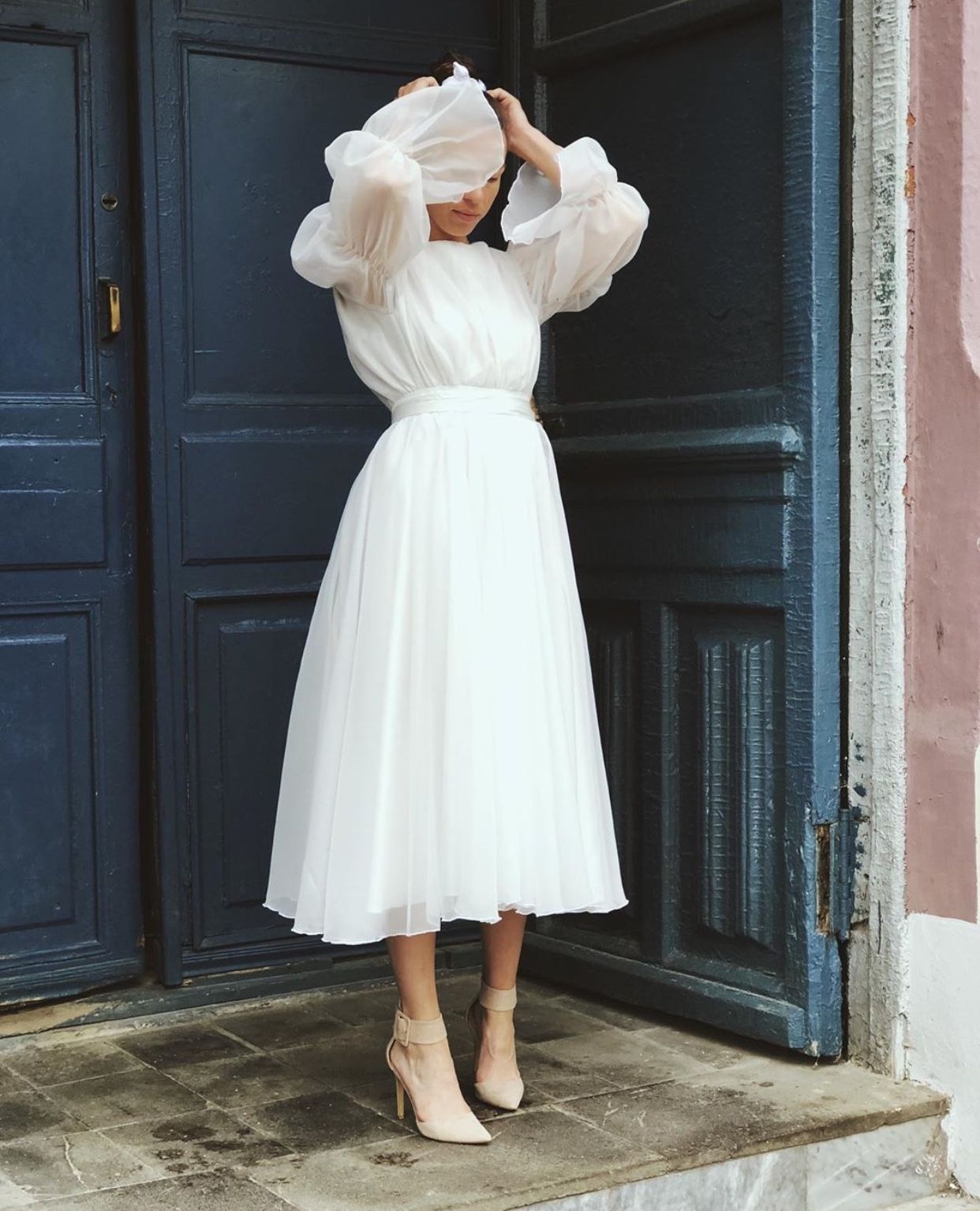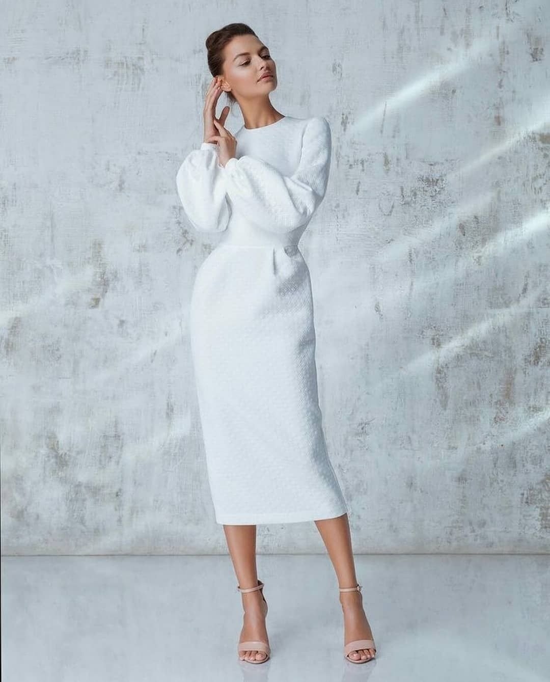 Белое платье с объемными рукавами