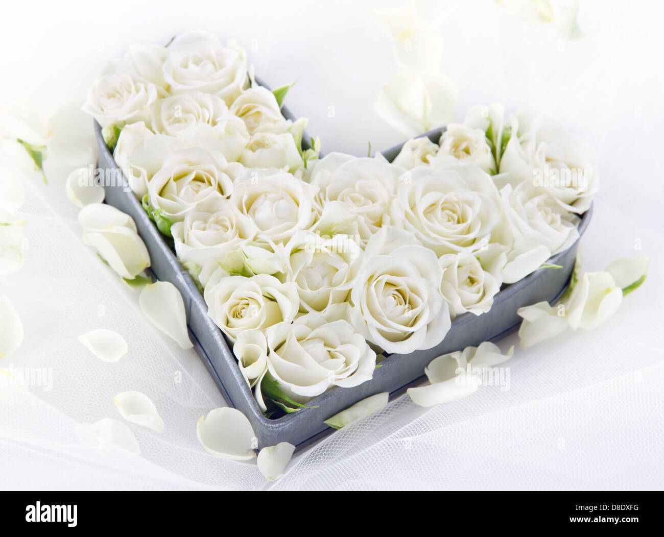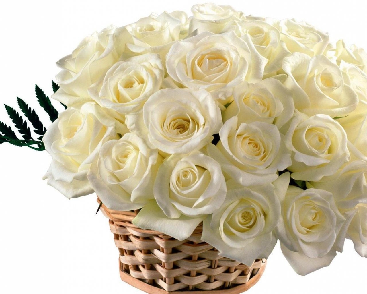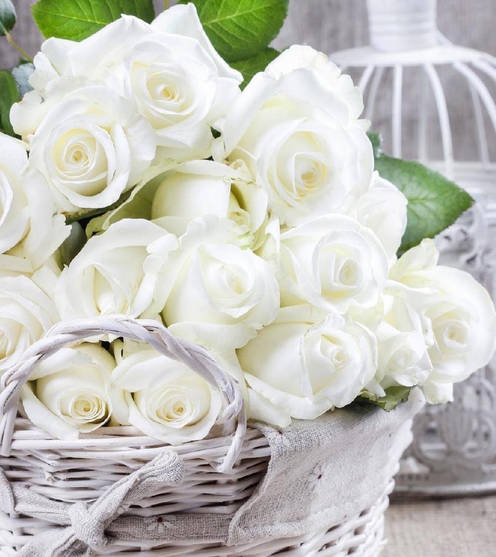 Красивый букет белых роз в корзинке