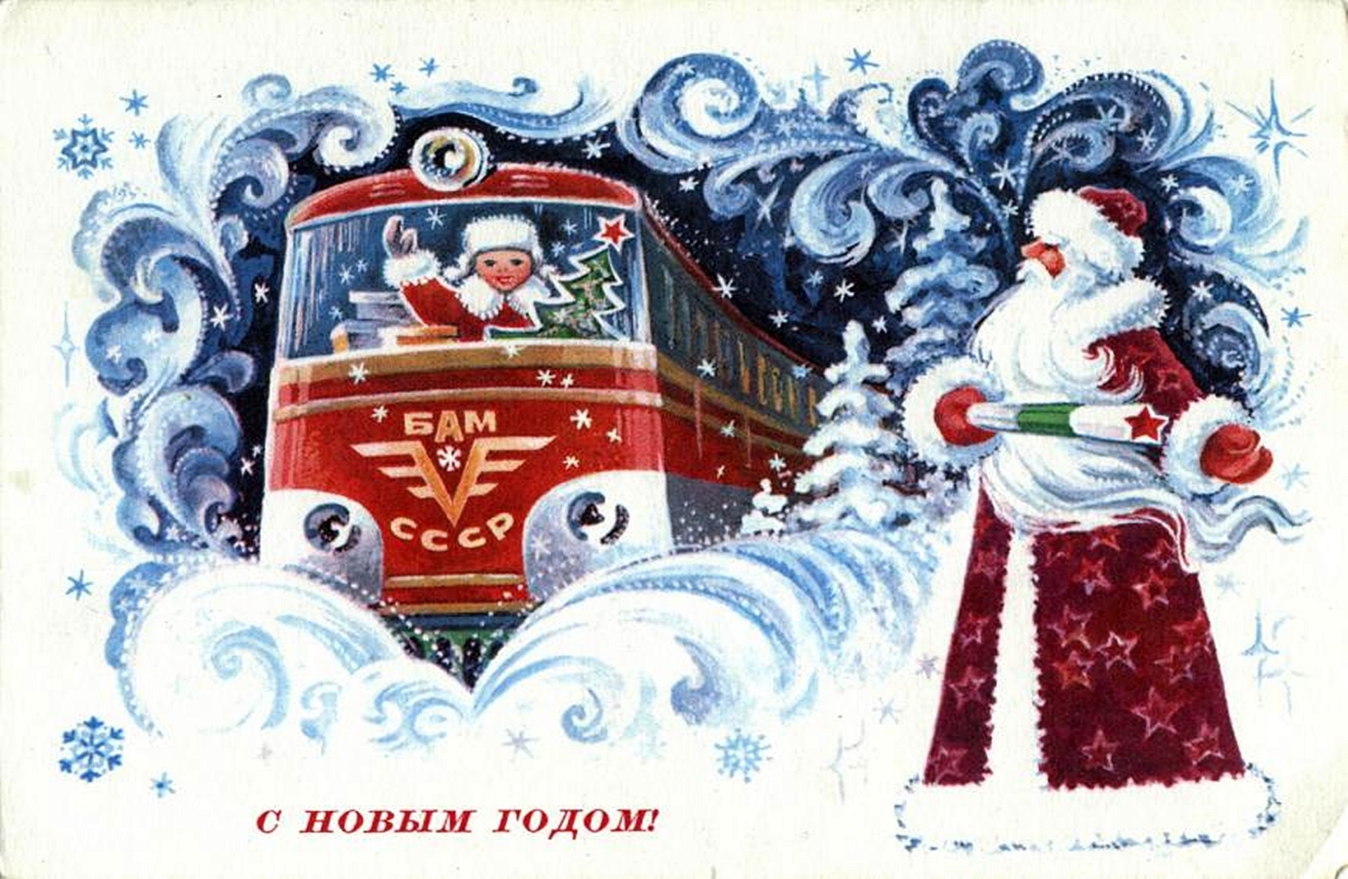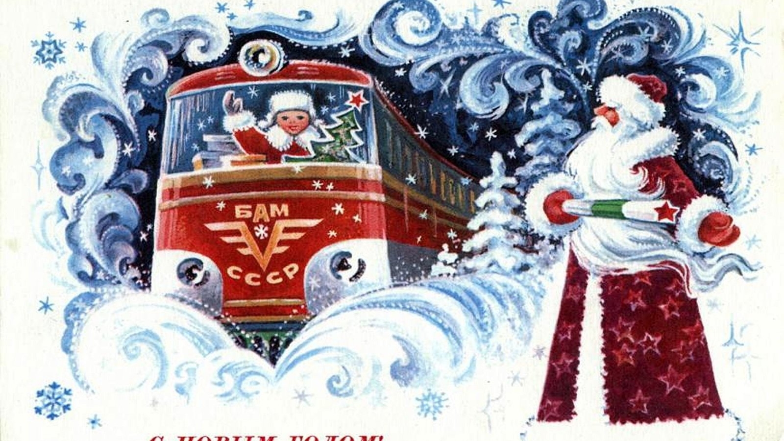 Новогодняя открытка СССР С поездом