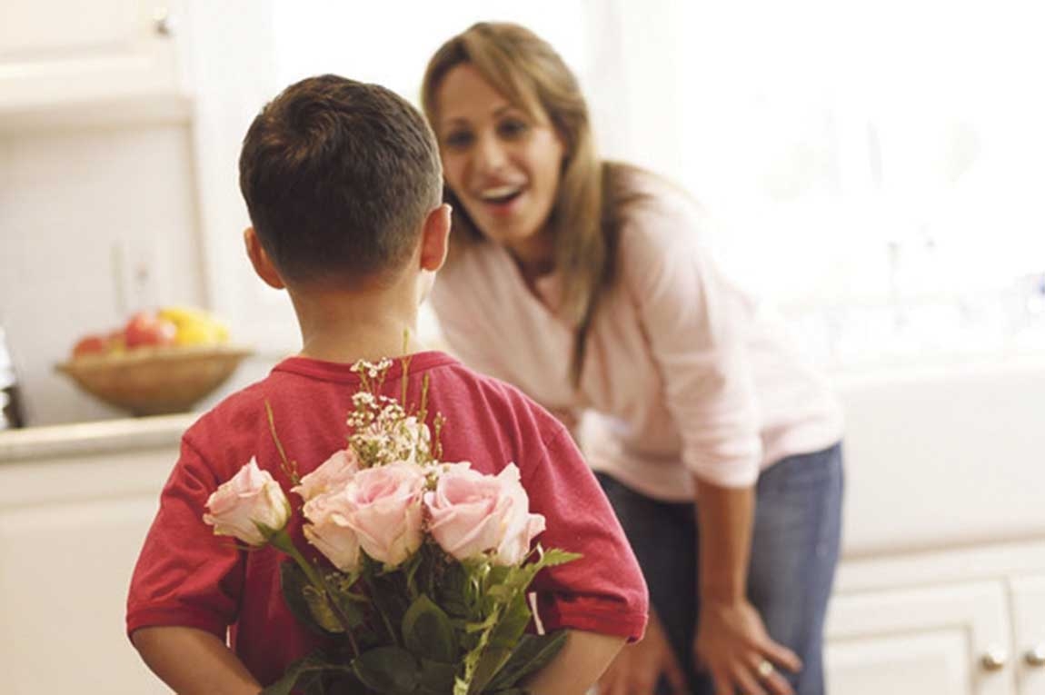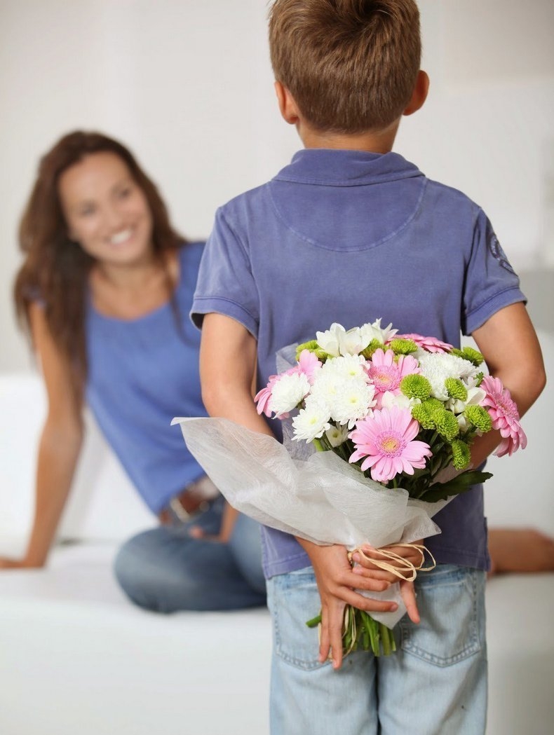 Мальчик дарит цветы маме