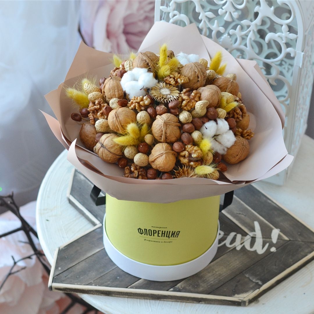 Букет из орехов в шляпной коробке