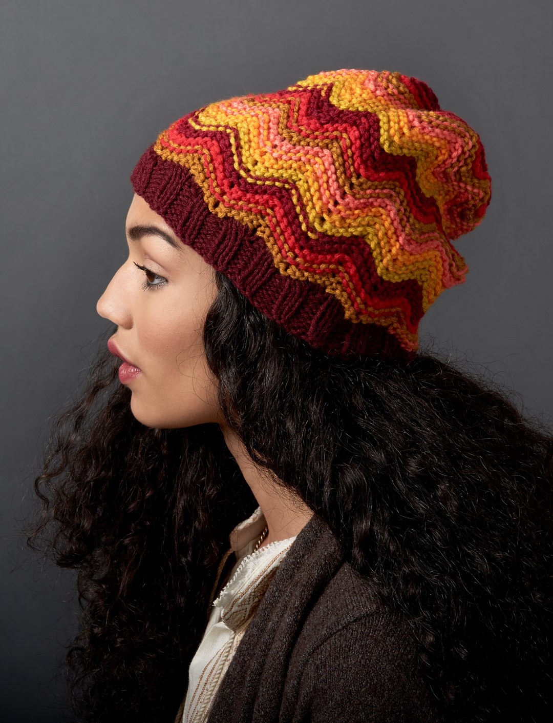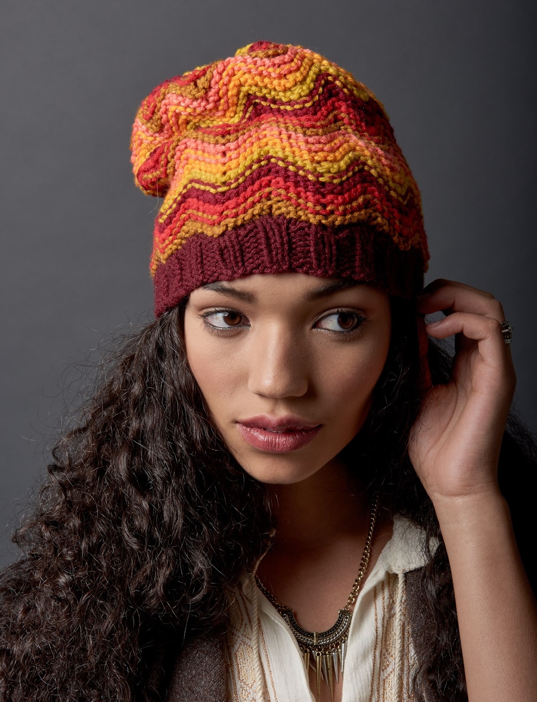Трехцветная вязаная шапочка