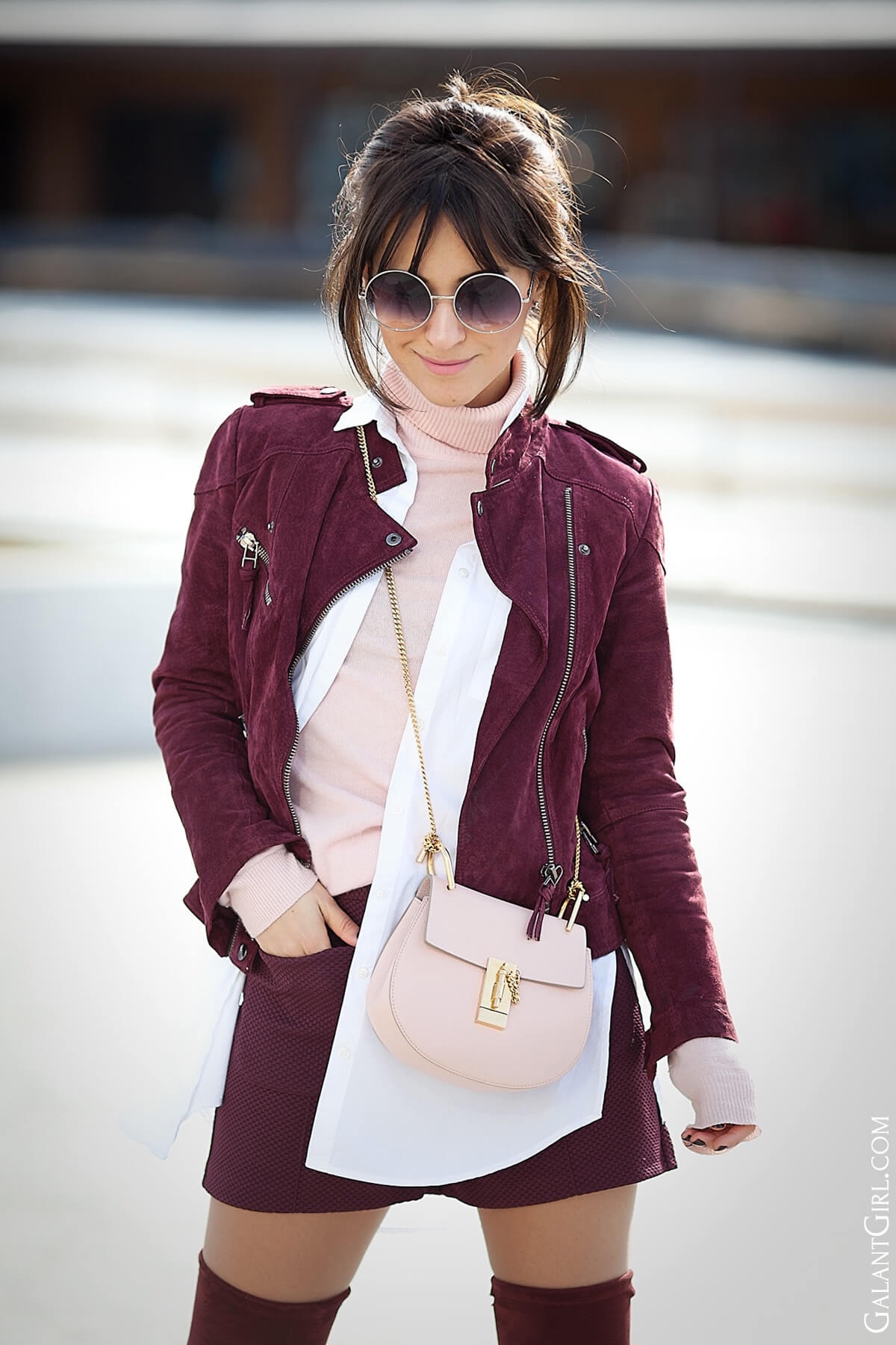 Сочетание пудрового и бордового в одежде