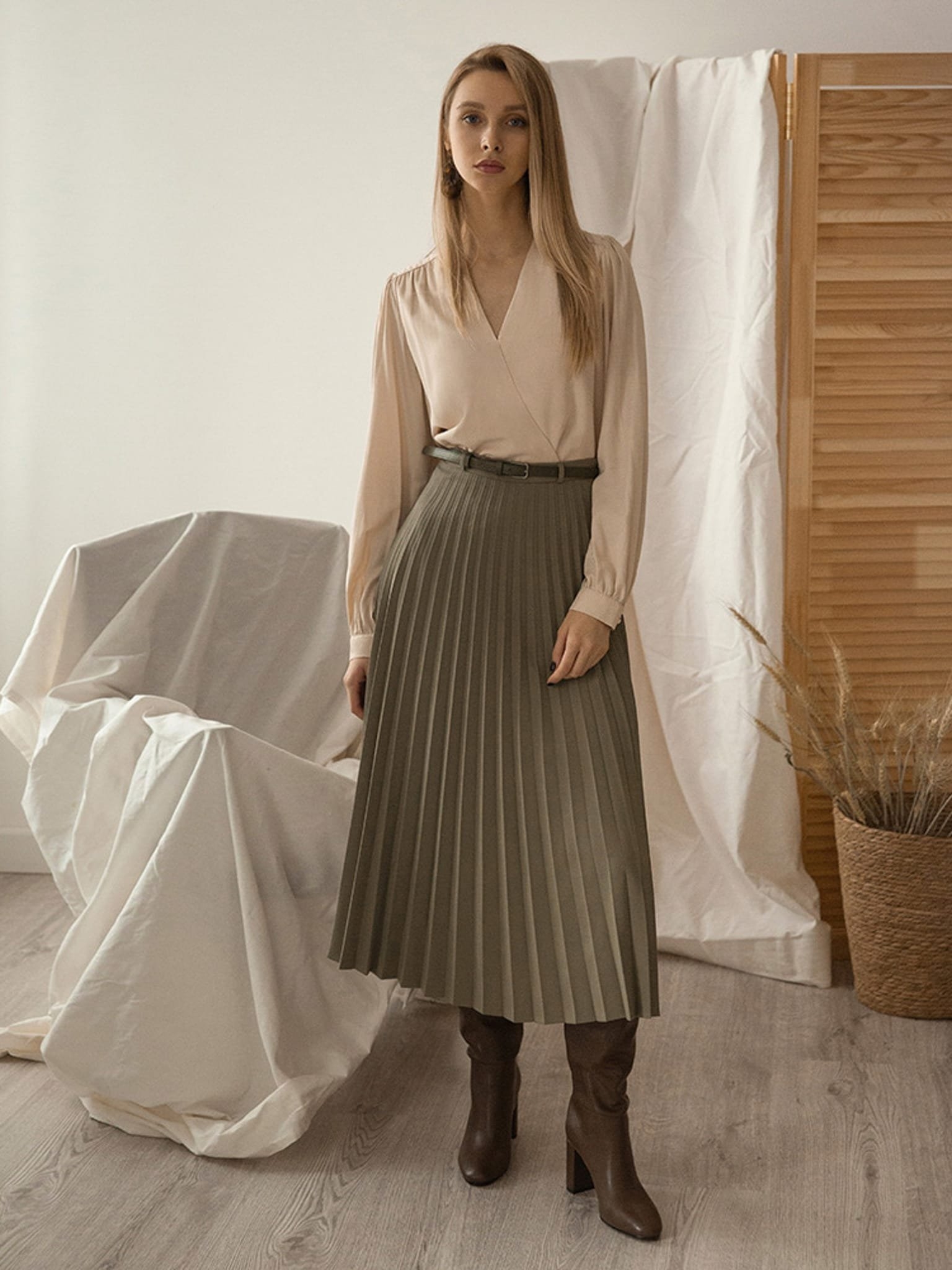 Образы с бежевой плиссированной юбкой