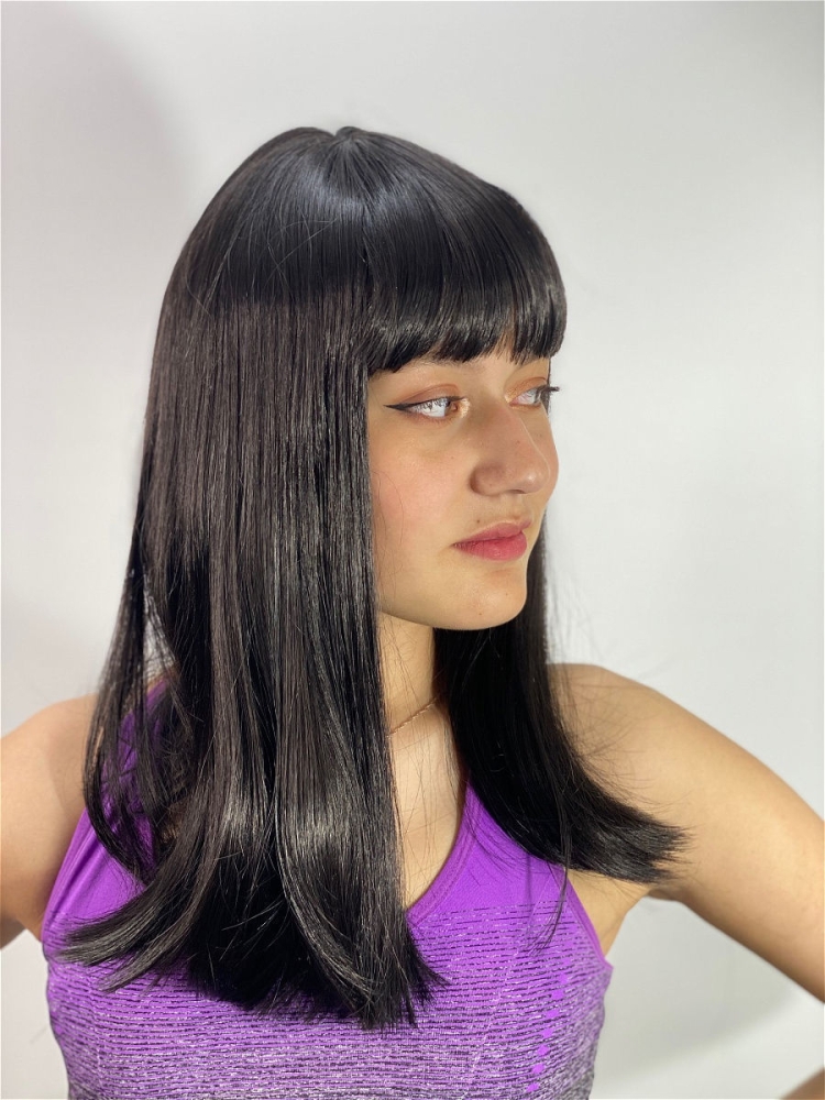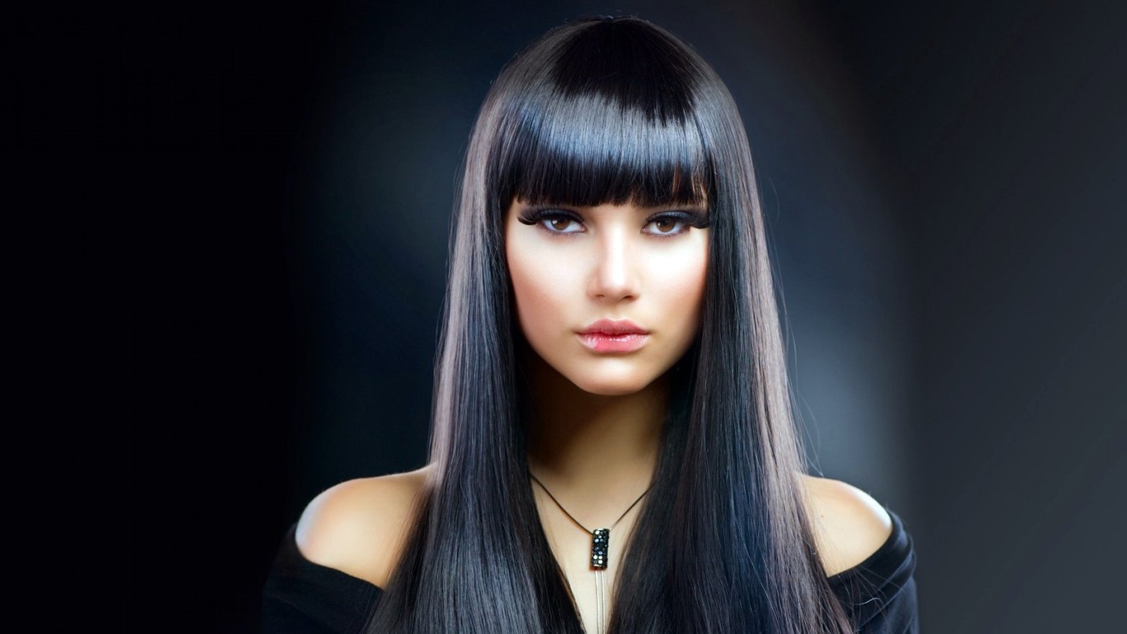 Брюнетка с челкой и длинными волосами