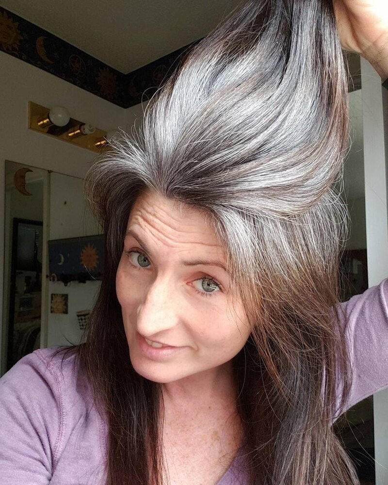 Чёрные волосы с седыми прядями