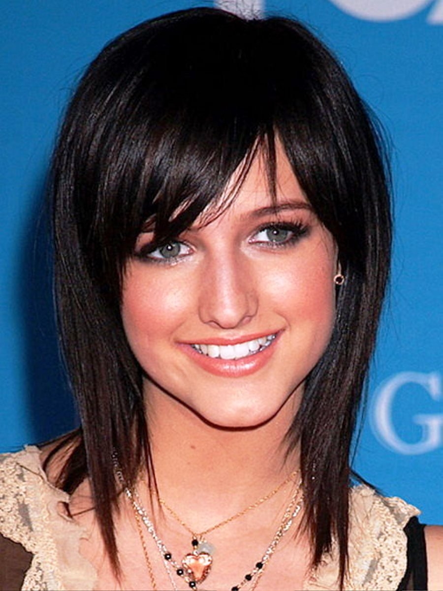 Каскад стрижка на средние волосы с челкой для круглого лица