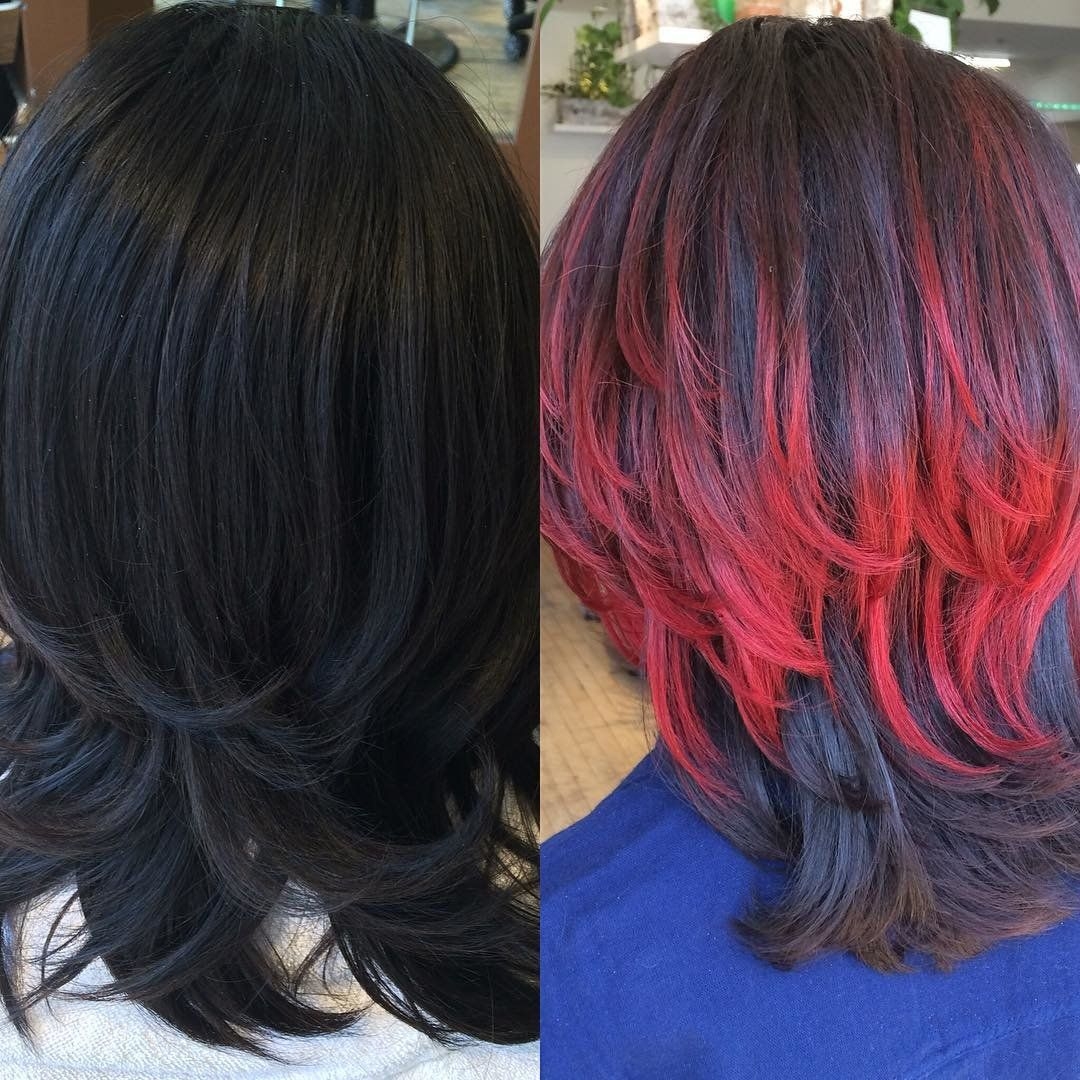 Цветное мелирование волос на темные волосы средней длины