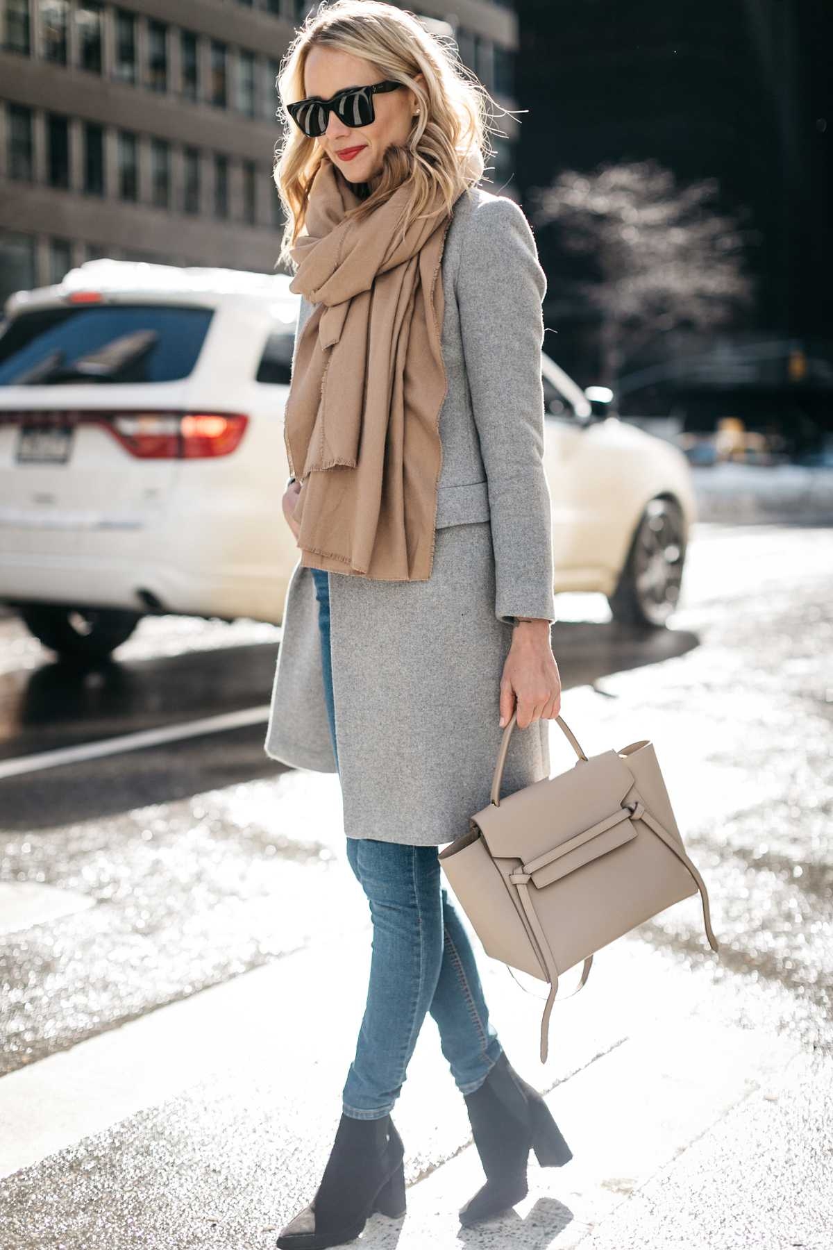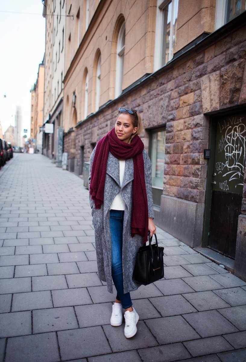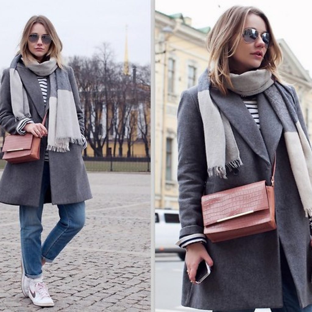 Серое пальто и шарф образы