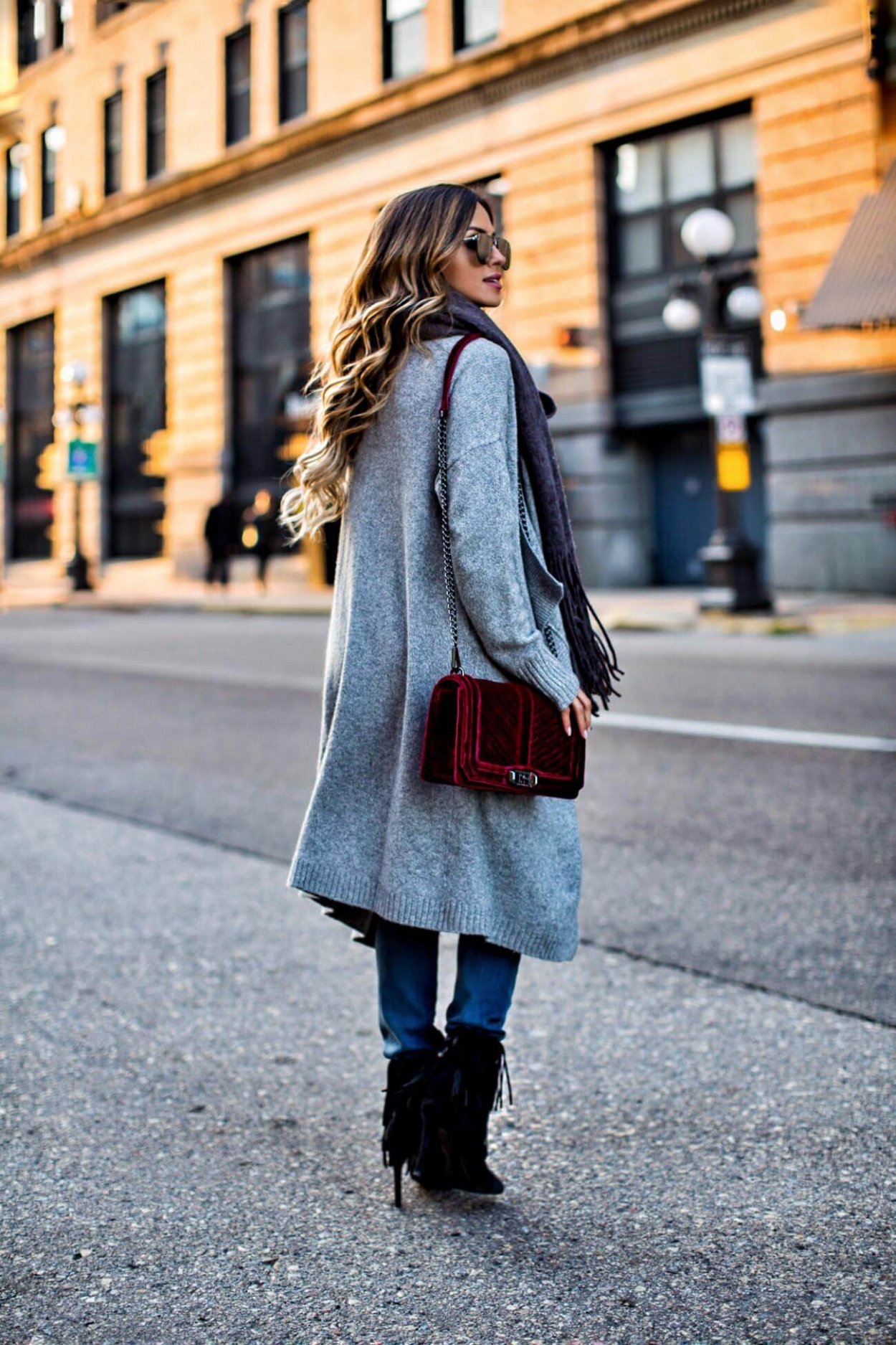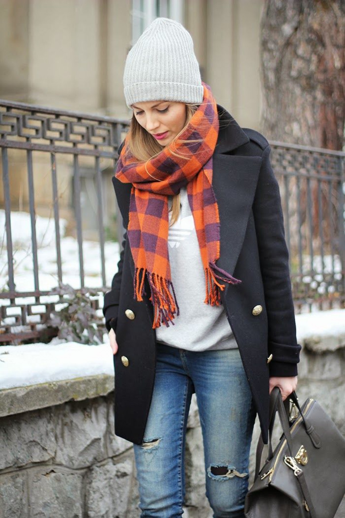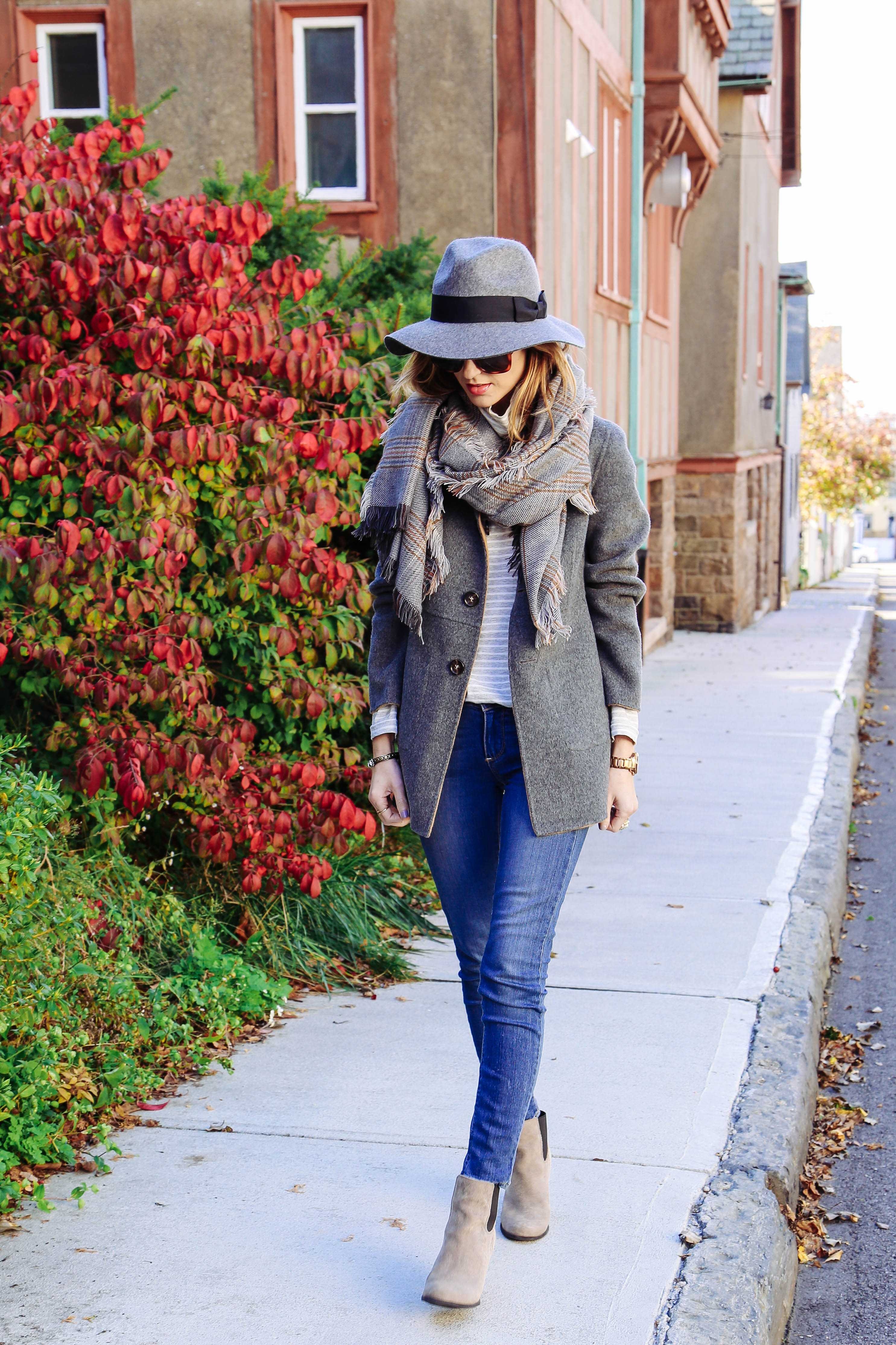 Серое пальто и шарф образы